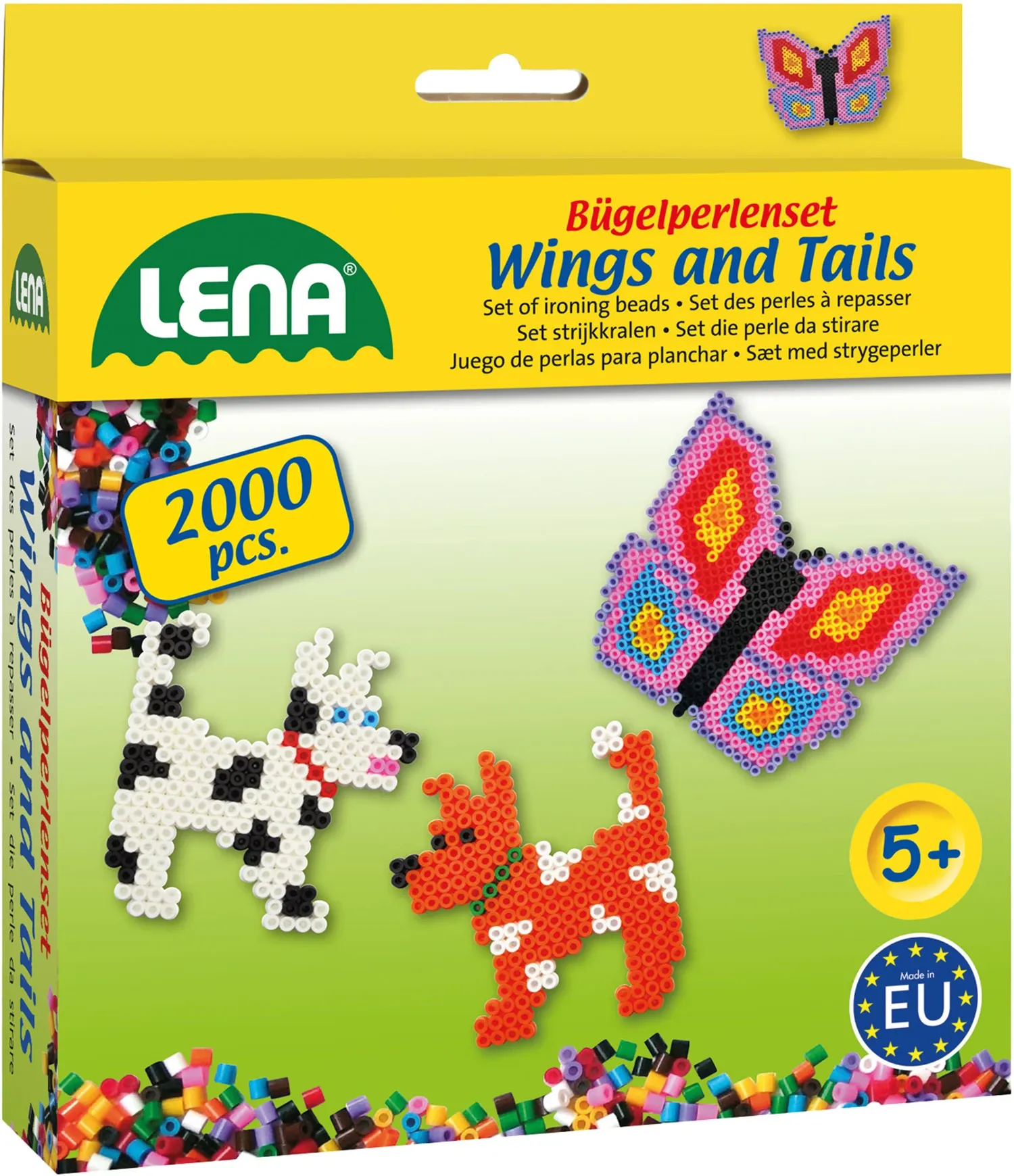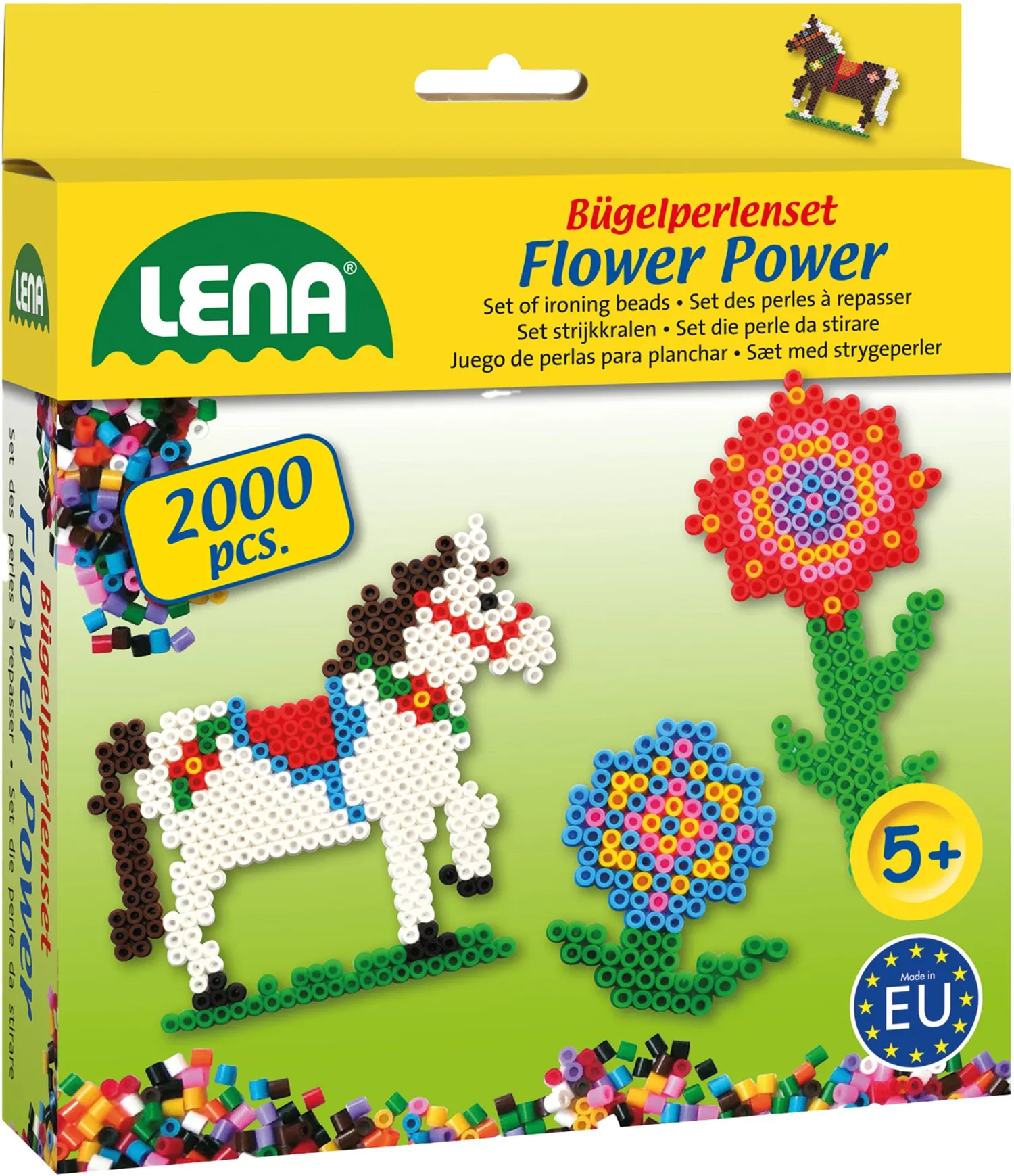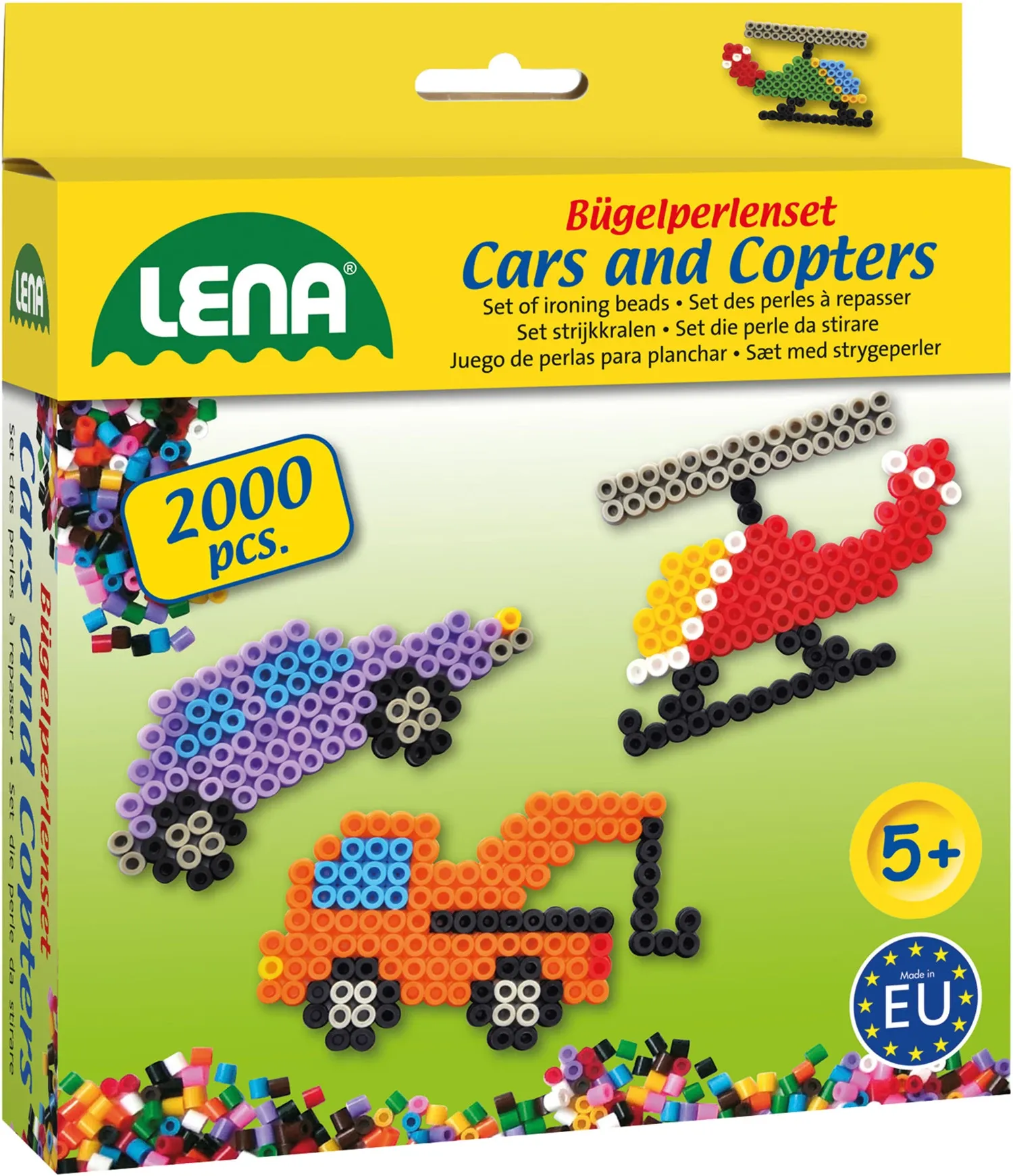 Motive: Flower Power (Pferd und Blumen), Cars and Copters (Fahrzeuge) oder Wings and Tails (Tiere). Das Set enthält jeweils 2000 Perlen (verschiedene Farben), 1 grosse Steckplatte, 2x Bügelpapier und 3 Vorlagen.