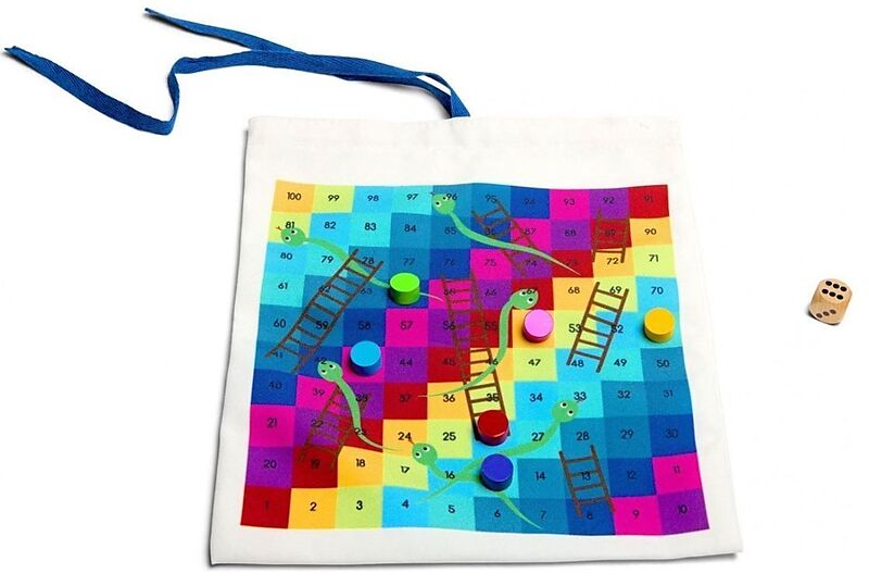 Zwei Spiele in einem Baumwollsäckchen die perfekte Kombination! Spiele Ludo oder das Leiterspiel, bei dem du nach oben kletterst, wenn du Glück hast, und nach unten purzelst, wenn du Pech hast!