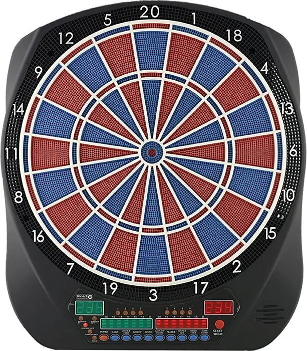 BULL'S E-Dart Flash RB-Sound Bull's Flash, elektronische Dartscheibe mit Zweiloch Segmenten,mit Netztteil, 4 LED Displays,6 Darts und 12 Ersatzspitzen sind im Lieferumfang enthalten. Bis 8 Spieler, 28 Spiele, 131 Varianten, Soundeffekt. Ab 14 Jahren. NEU mit d...