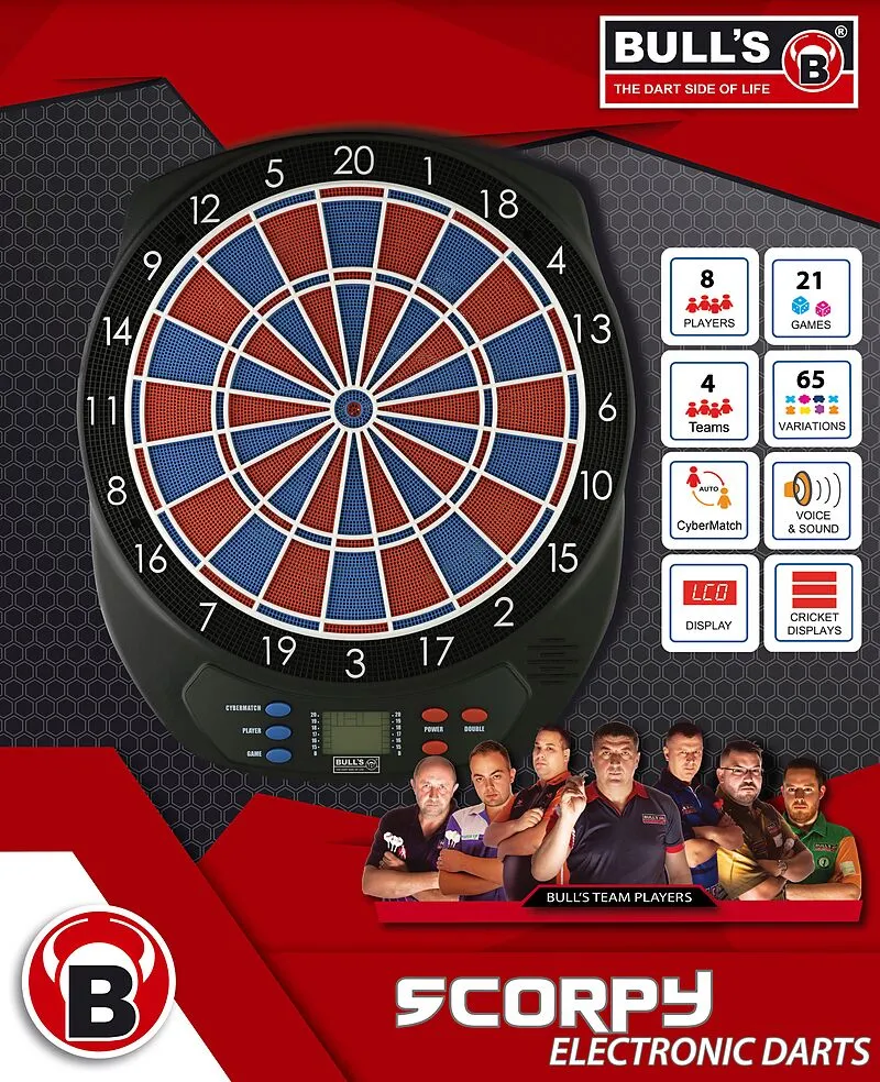 BULL'S E-Dart-Scorpy Zweiloch Elektronische Dartscheibe mit Zweiloch Segmenten. Inkl. Netzteil, Batteriebetrieb möglich (nicht enthalten). LCD-Display, 6 Darts und 12 Ersatzspitzen sind im Lieferumfang enthalten. Für bis zu 8 Spieler, 21 Spiele, 65 Varianten. ...