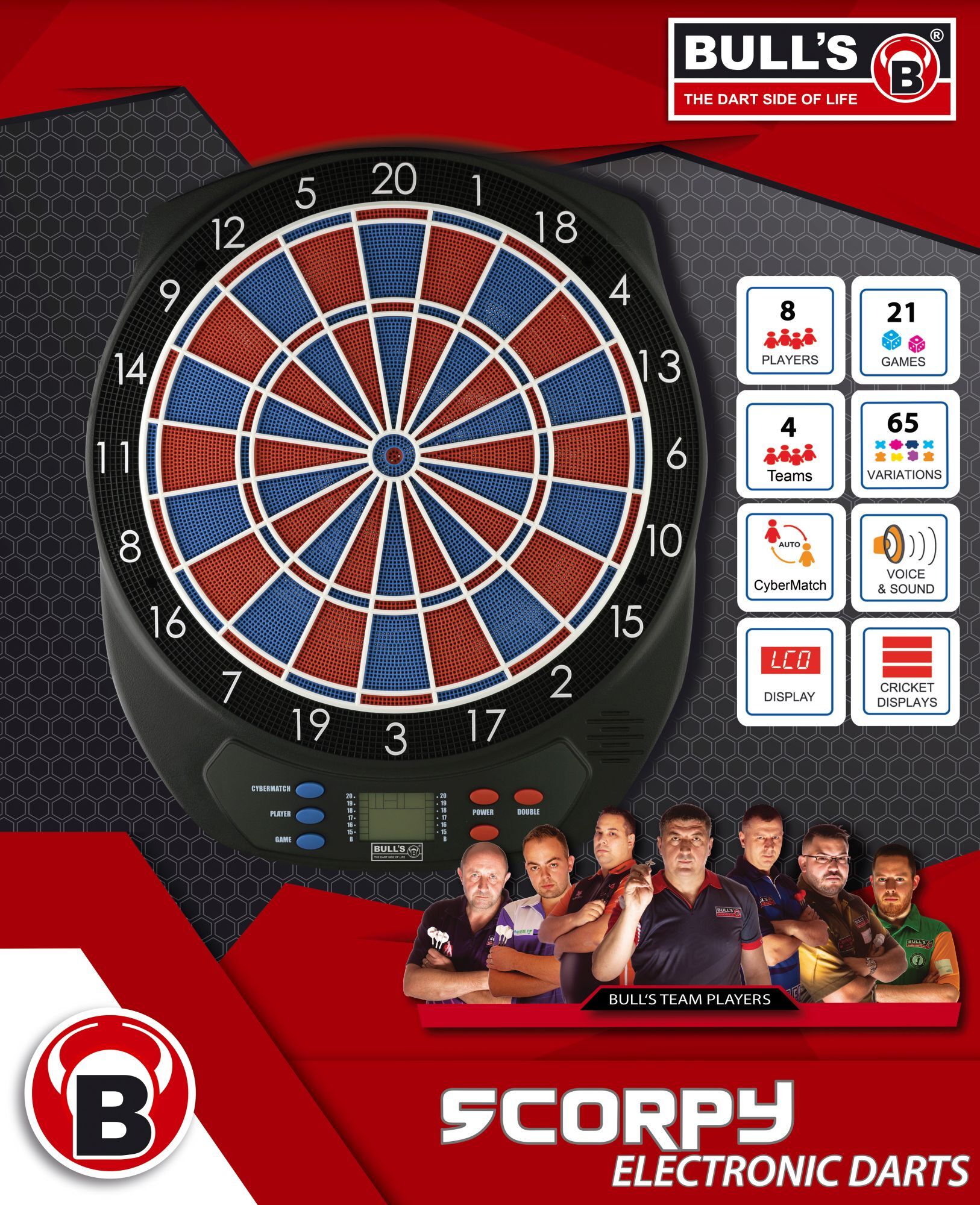 BULL'S E-Dart-Scorpy Zweiloch Elektronische Dartscheibe mit Zweiloch Segmenten. Inkl. Netzteil, Batteriebetrieb möglich (nicht enthalten). LCD-Display, 6 Darts und 12 Ersatzspitzen sind im Lieferumfang enthalten. Für bis zu 8 Spieler, 21 Spiele, 65 Varianten. ...