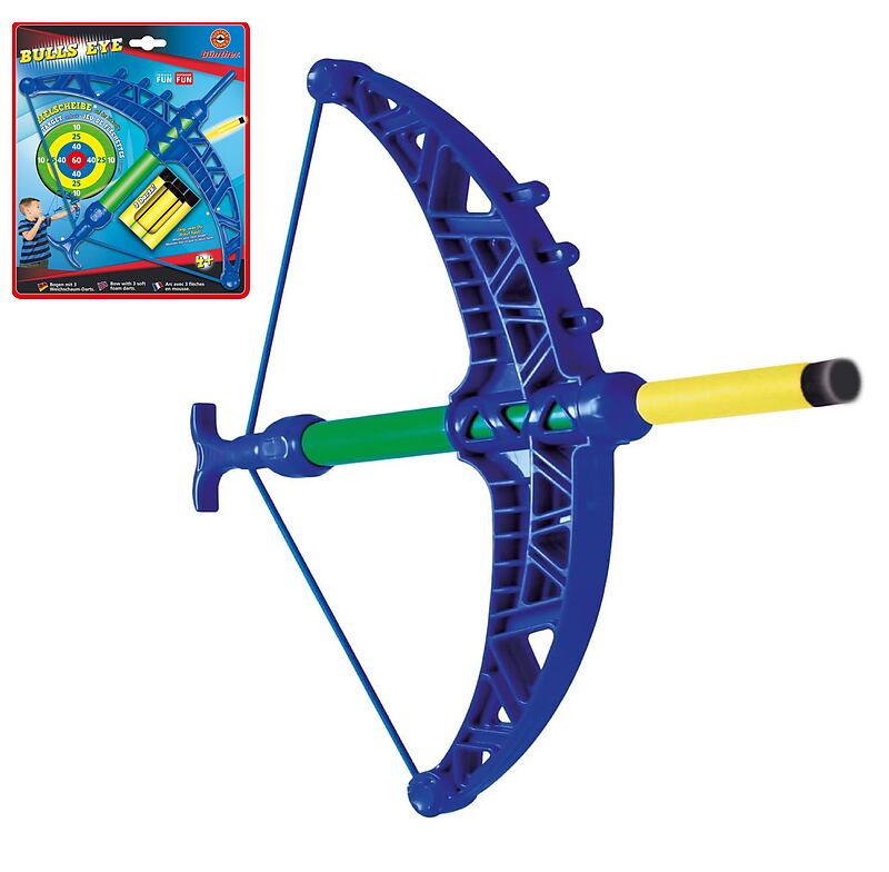 Bogen mit drei Weichschaumdarts. Teste wie gut du drauf bist - Zielscheibe auf der Verpackung. Für drinnen und draußen. Größe: ca. 26 x 29 cm. Für Kinder ab 4 Jahren.