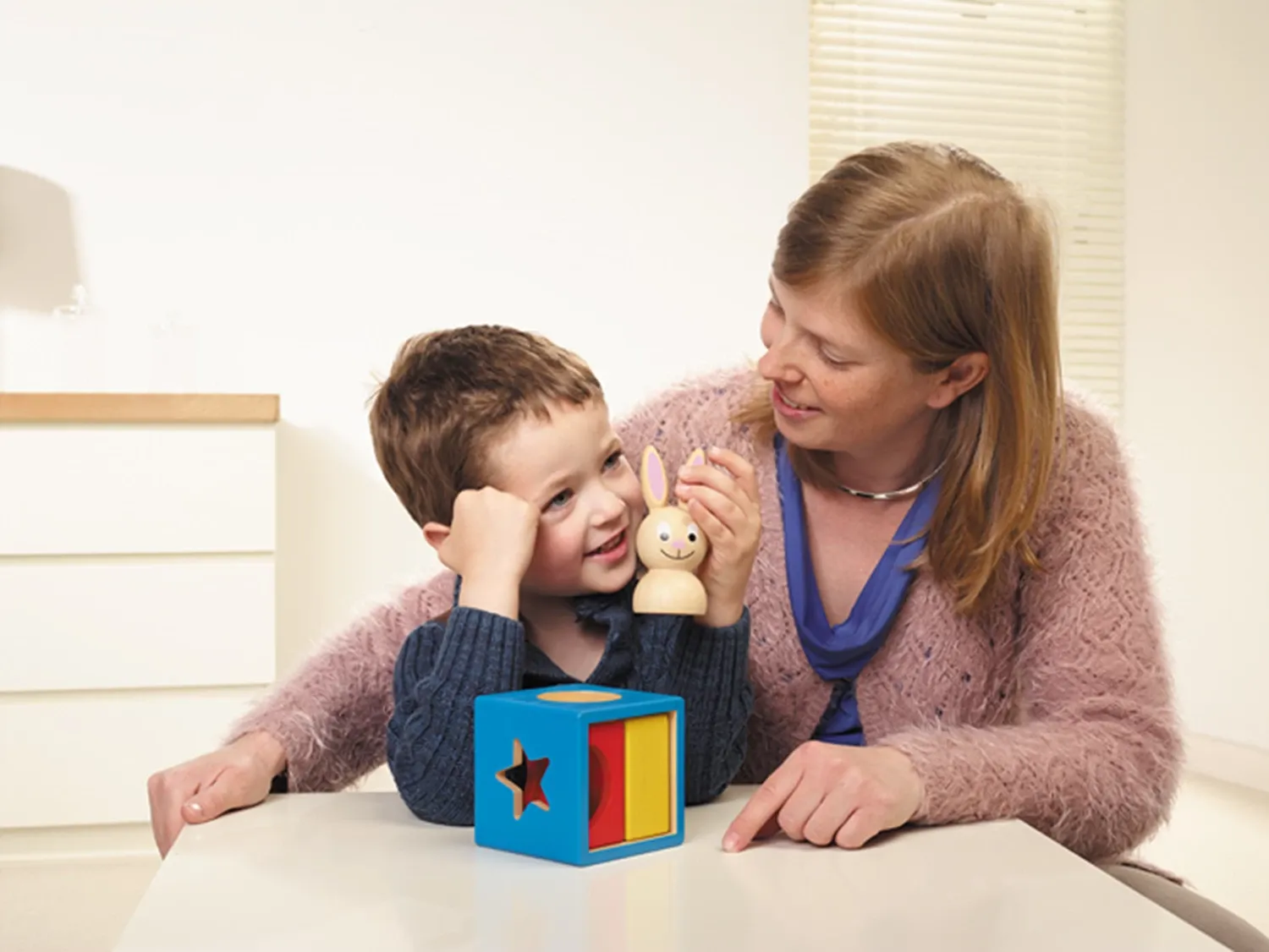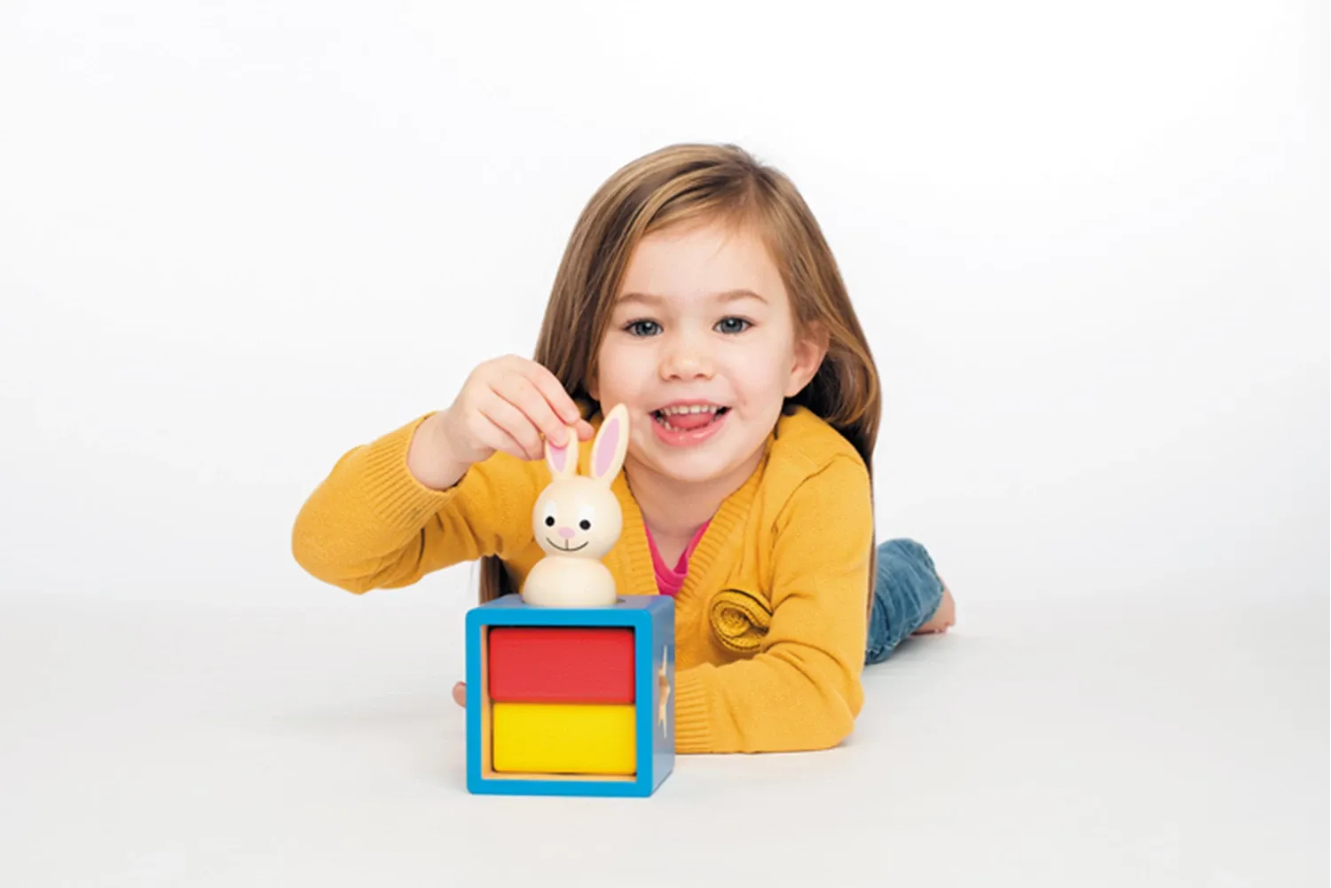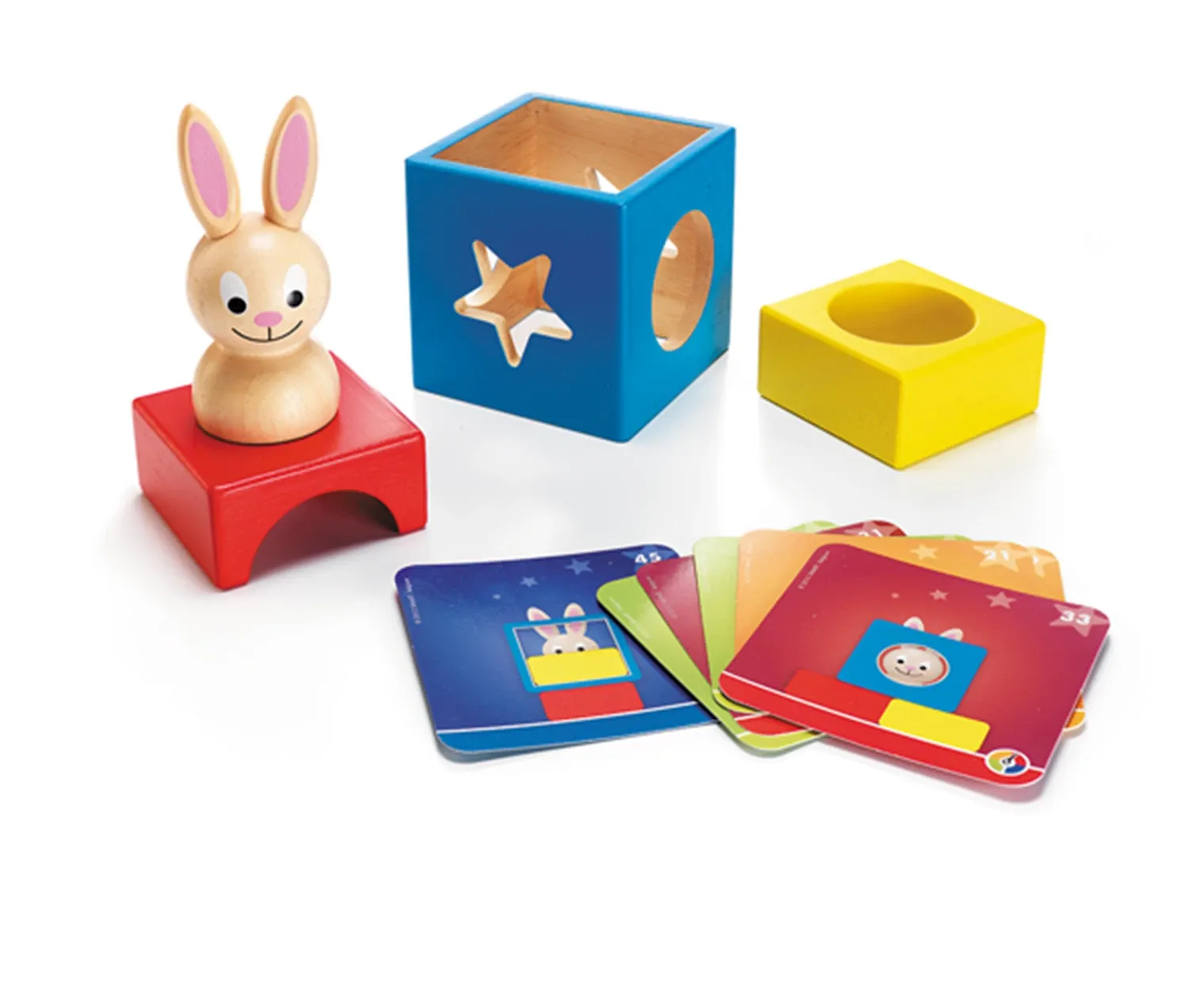 Bunny Boo ist ein 3D Puzzle für die ganz kleinen mit vier stabilen Holzklötzen. Durch welche Öffnung schaut es denn nun? Durch die runde, oder die sternförmige Öffnungoder steht es vielleicht so, dass es schon über die Zauberkiste hinweg sehen kann? Die Kinder...