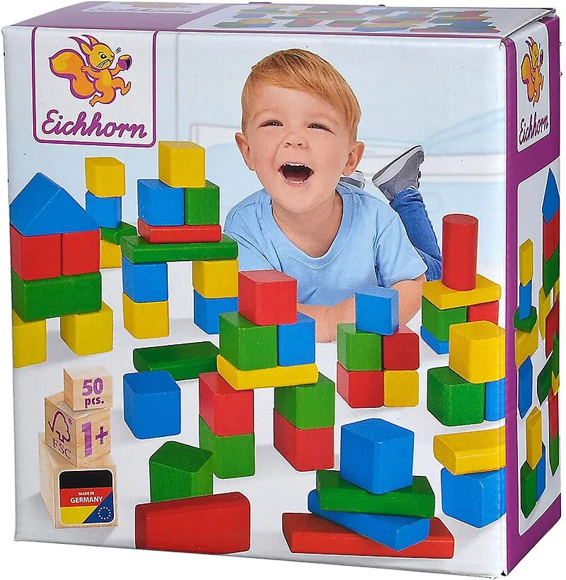 Die 50 bunten Holzbausteine von Eichhorn bieten den Kleinen ab einem Jahr ein wahres Spielparadies. Das Errichten von Türmen oder anderen Bauten fördert die Kreativität und die Motorik.