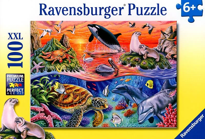 Dieses wunderschön bunte Puzzle zeigt das Leben über und unter den Wellen. Über den Wellen sehen wir verschiedene Seevögel, eine Krabbe, Seesterne und einen aus dem Wasser springenden Killerwal, unter den Wellen tummeln sich tropische Fische, eine Schildkröte,...