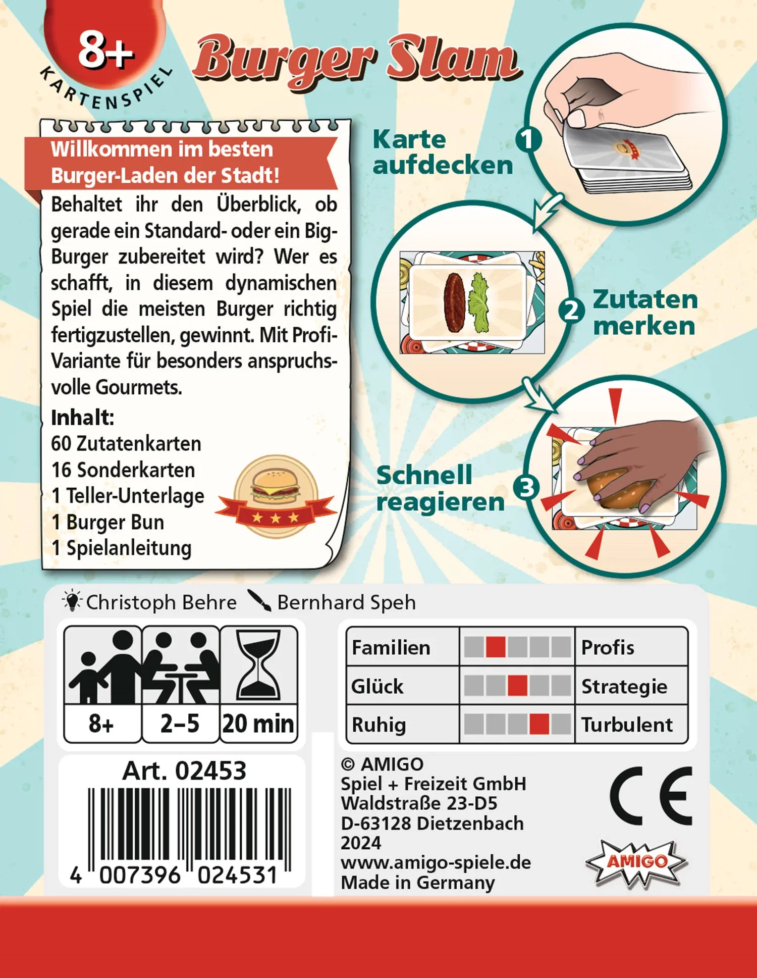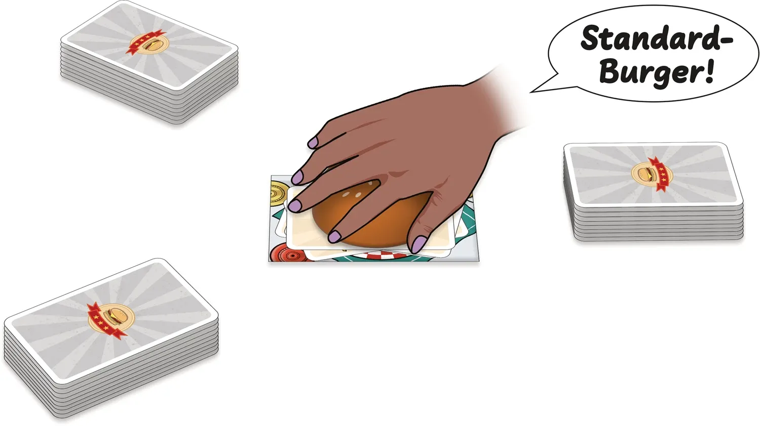 Burger Slam Burger Slam MBE3 Willkommen im besten Burger-Laden der Stadt! Die Spielenden decken reihum Karten auf und sagen in diesem dynamischen Reaktionsspiel an, wenn ein Standard- oder ein Big Burger fertig ist. Wer es schafft, die meisten Burger richtig f...