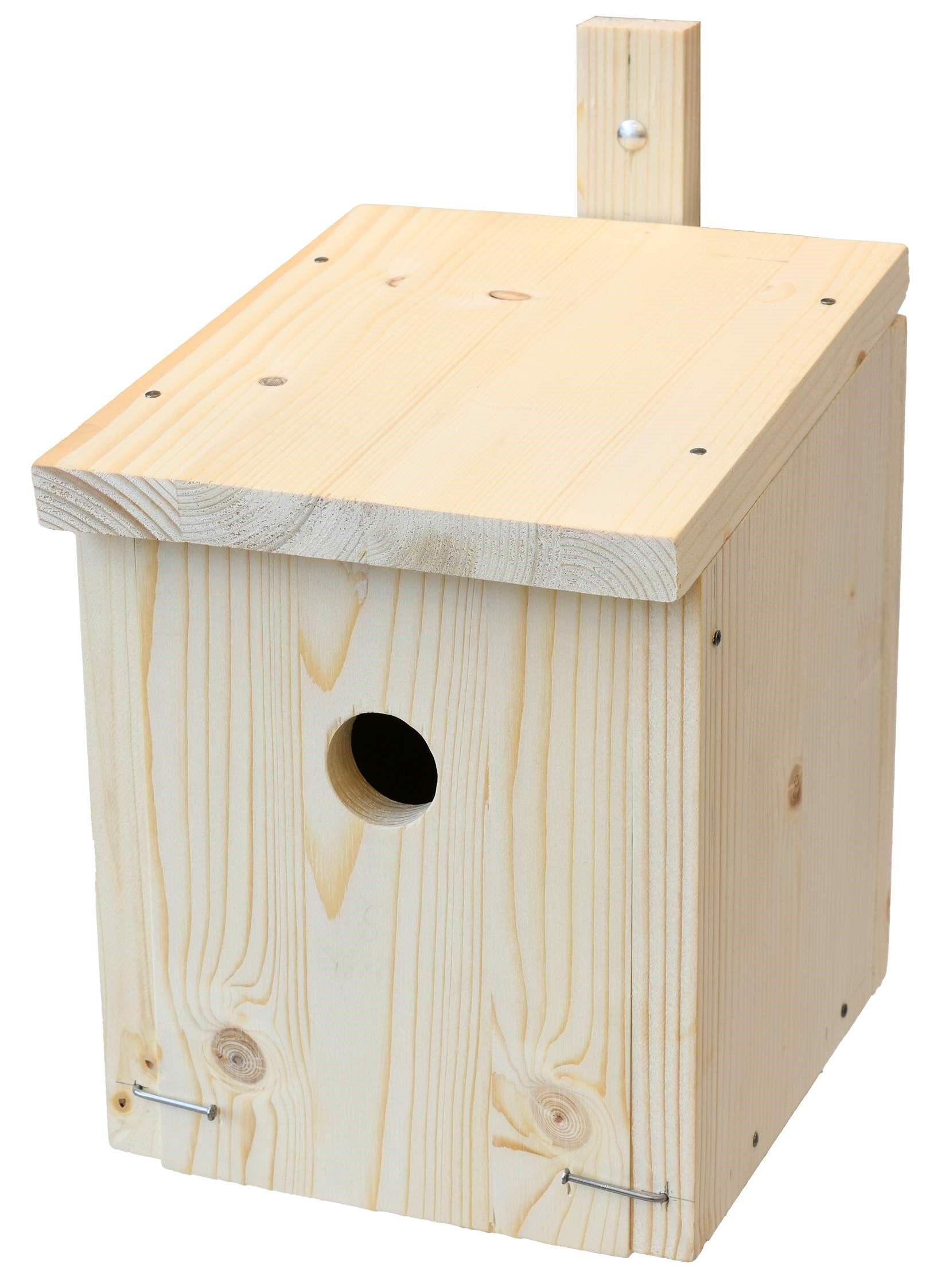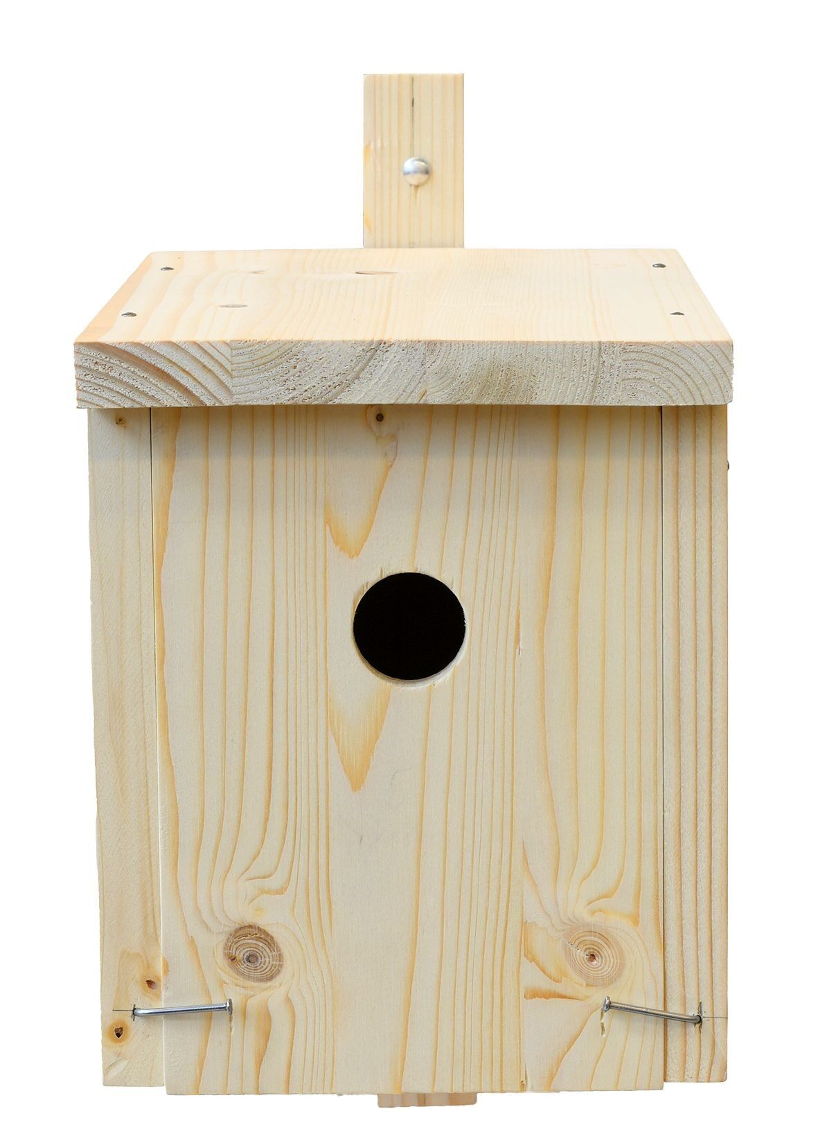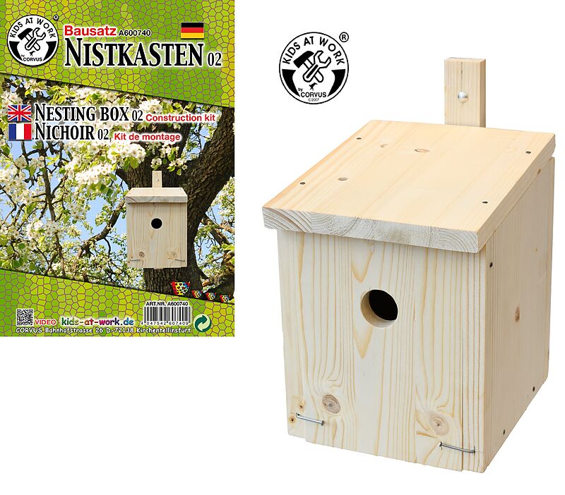 Nistkastenbausatz, aus Leimholz mit 18 mm Dicke. Mit 20 Stahlnägeln und 2 Forstnägeln. Die Montage erfordert ein paar einfache handwerkliche Tätigkeiten (Anzeichnen, Bohren, Leimen, Nageln). Unter Anleitung eines Erwachsenen und mit der ausführlichen Bauanleit...
