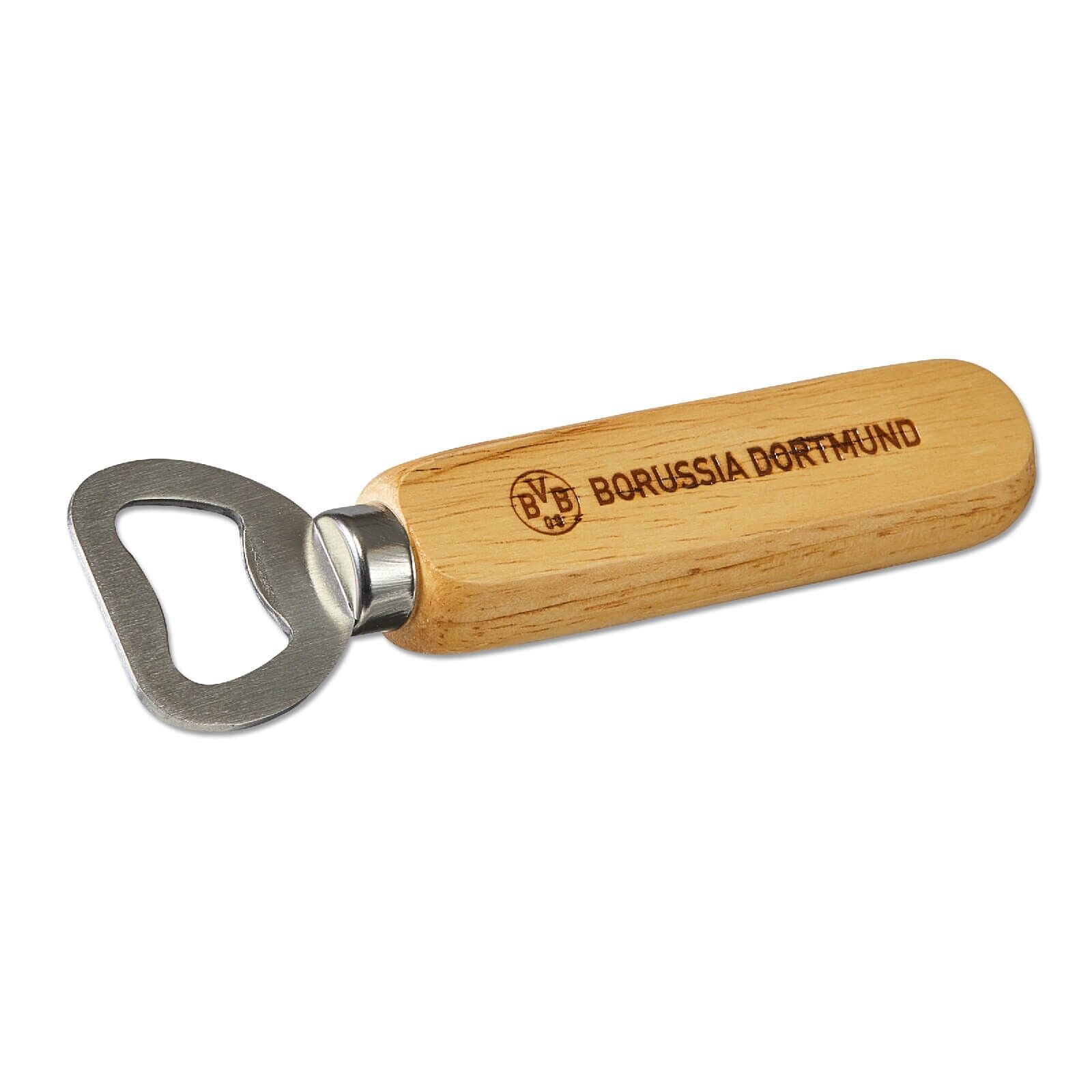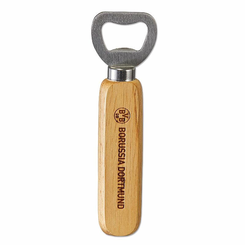 BVB Flaschenöffner mit Holzgriff und einseitigem Druck.