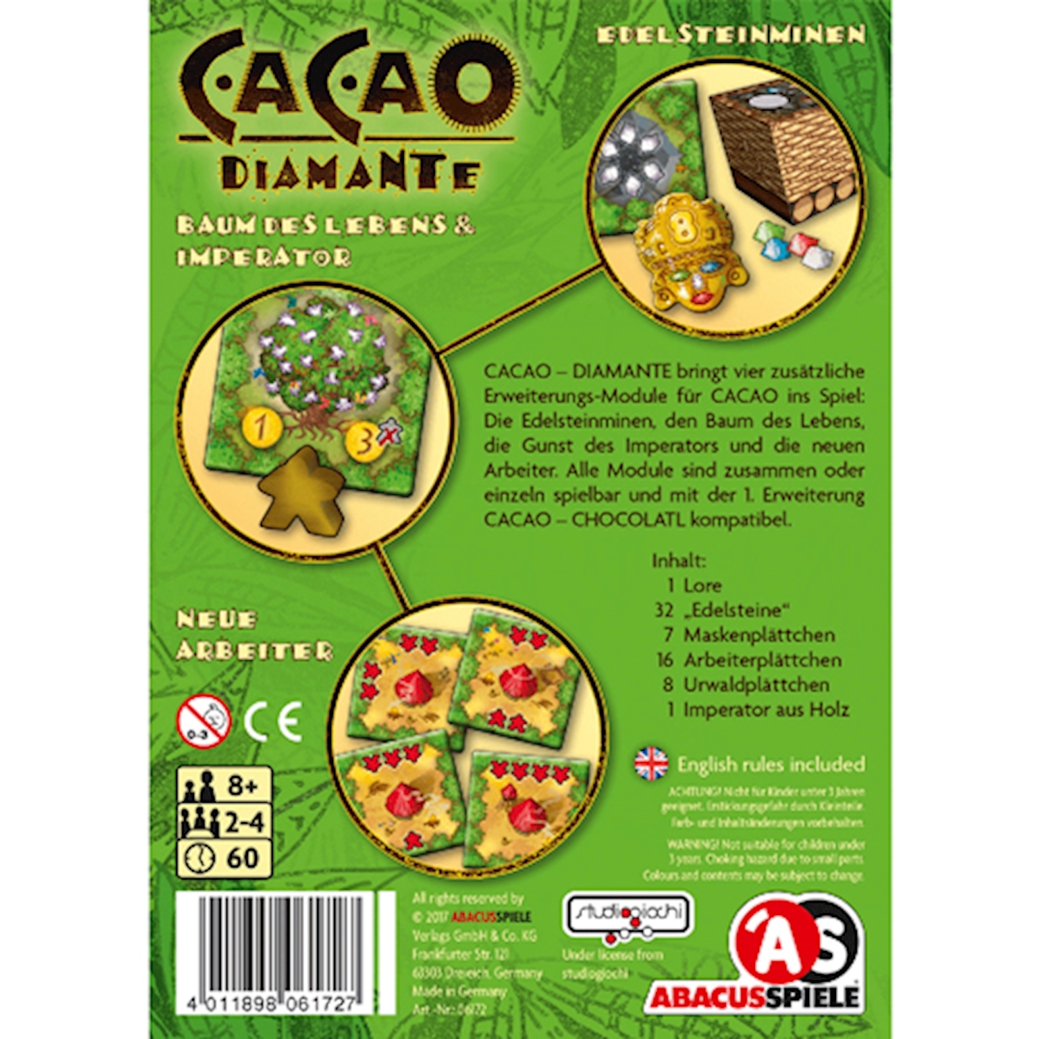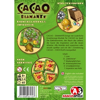Cacao - Diamante bringt vier zusätzliche Erweiterungs-Module für Cacao ins Spiel: Die Edelsteinminen, den Baum des Lebens, die Gunst des Imperators und die neuen Arbeiter. Alle Module sind zusammen oder einzeln spielbar und mit der 1. Erweiterung Cacao - Choco...
