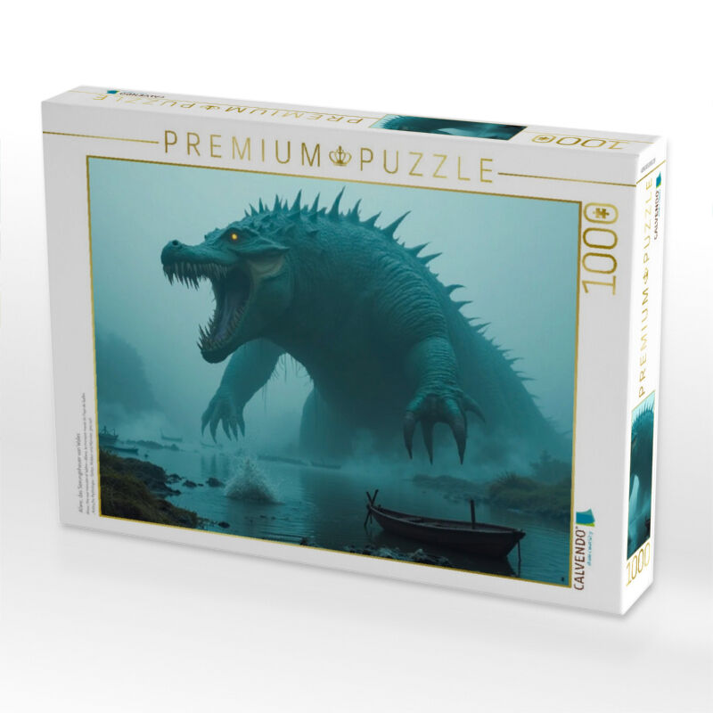 Der Afanc erhebt sich als monströses Wasserwesen aus einem dunklen, walisischen See - ein hybrides Tier mit krokodilartigen Kiefern, schuppiger Haut und biberähnlichem Schwanz. Riesig, mit leuchtenden Augen und schleimiger Haut, versprüht es Wasserfontänen aus...