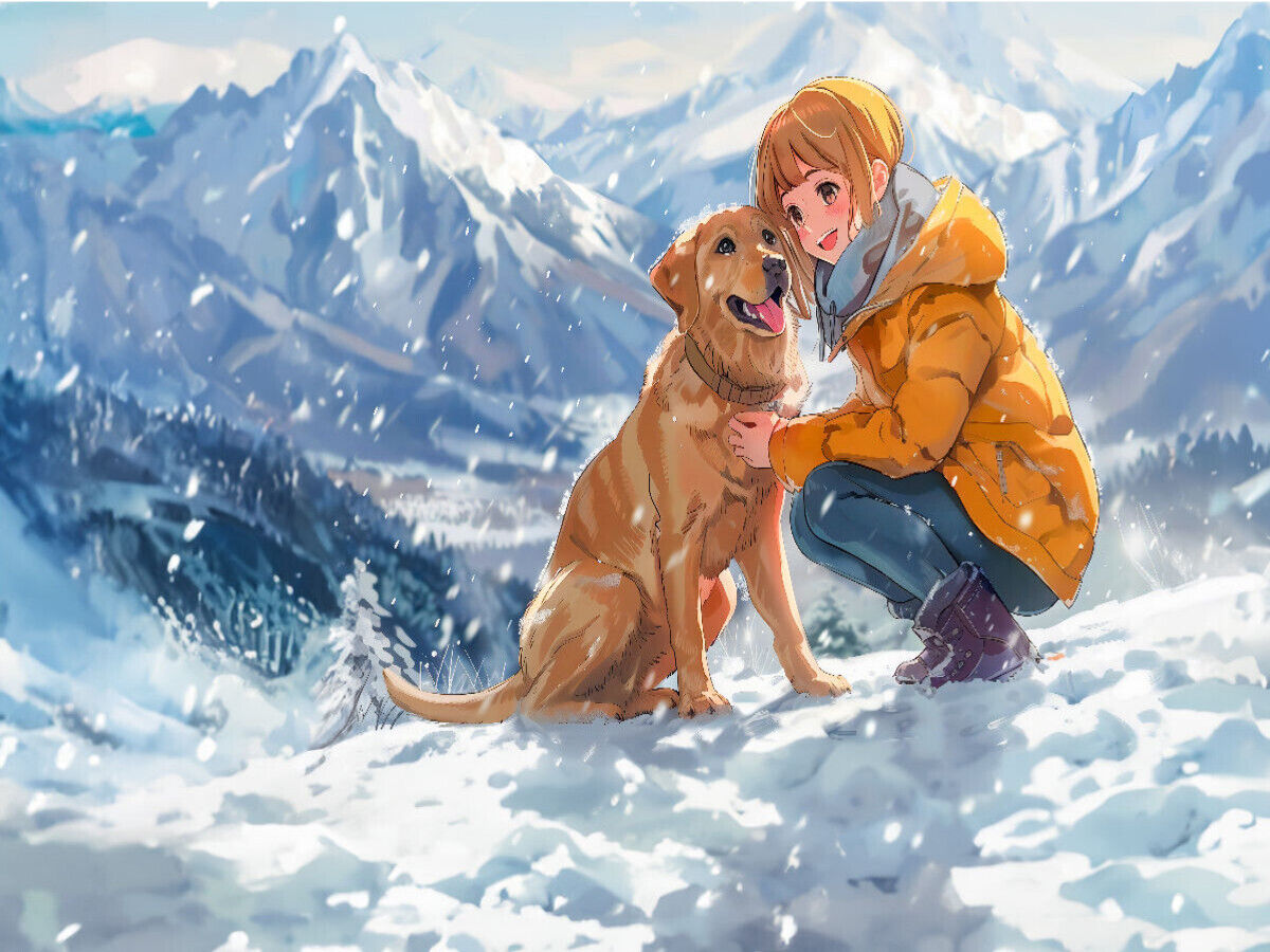 Ein Anime-Mädchen begibt sich mit ihrem Hund auf eine malerische Winterwanderung in den Bergen. Die Szene strahlt Abenteuerlust und Freude aus, während sie gemeinsam durch den verschneiten Wald wandern und die majestätische Schönheit der Berglandschaft bewunde...