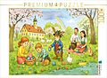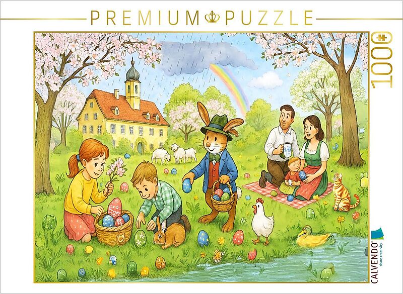 Familien beim Ostereiersuchen, blühende Wiesen und ein Dorf im Frühlingsglanz - dieses Wimmelbild erzählt vom ländlichen Osterfest. Motiv aus dem Kalender "Bayrische Wimmelbilder - Wo Heimat lebendig wird". Für Puzzle und Leinwand geeignet.