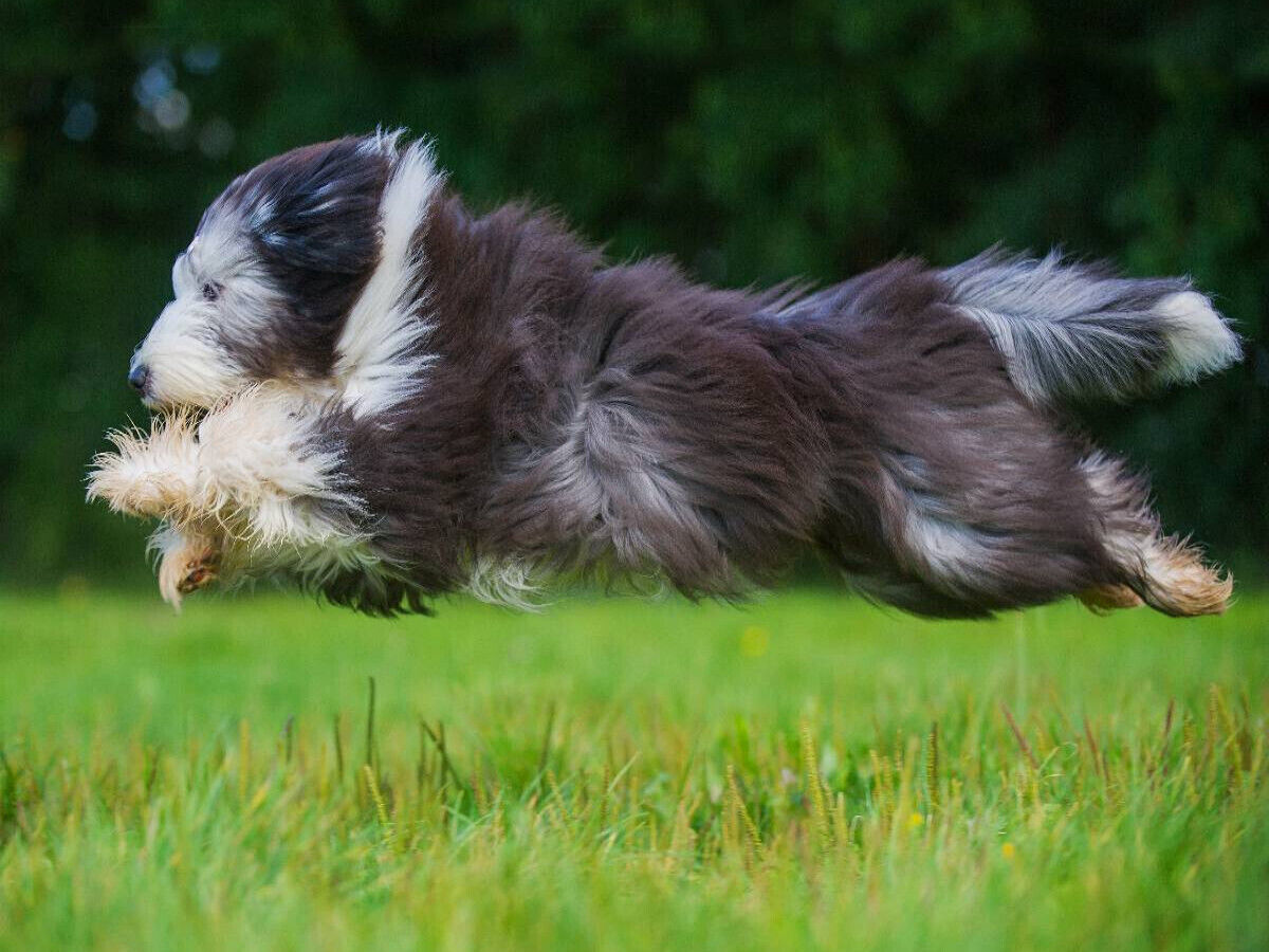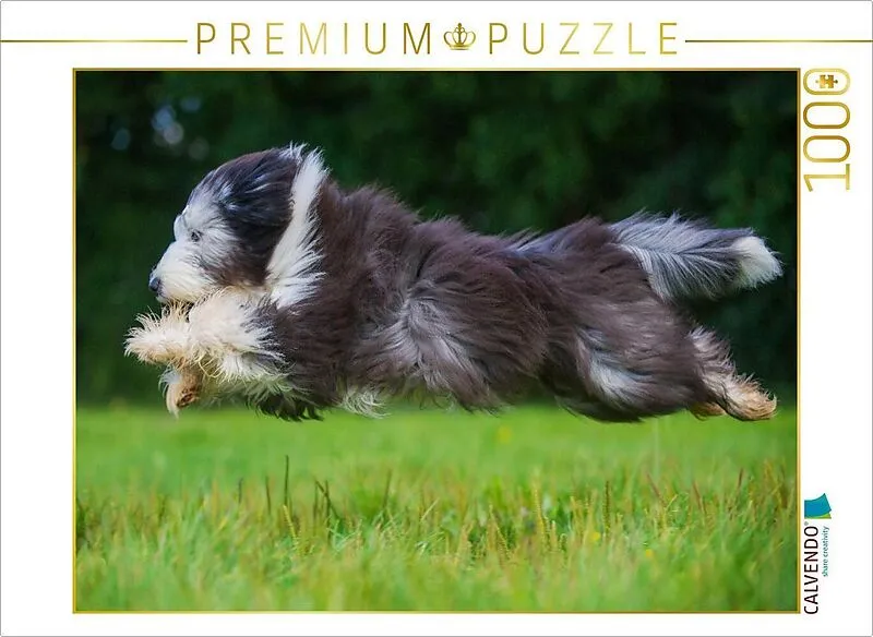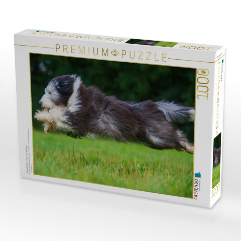 CALVENDO Puzzle Bearded Collie im Flug über die Wiese | 1000 Teile Lege-Größe 64x48cm Foto-Puzzle für glückliche Stunden
