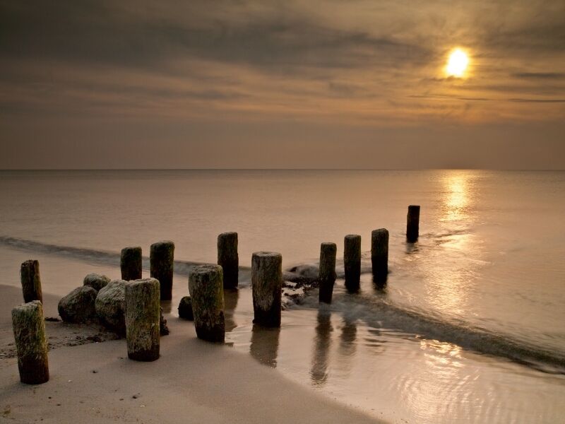 Buhnen an der Küste der Ostsee im Lichte des Sonnenuntergang. Egal ob als Geschenk oder zum Selbermachen: Puzzles sind unterhaltend und fördern das Wohlbefinden. Puzzeln stimuliert beide Seiten des Gehirns, verbessert die visuelle Wahrnehmung und schult die Ko...