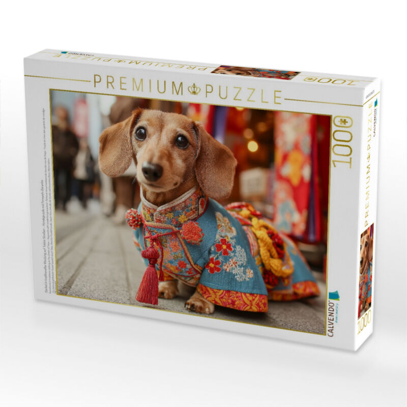 Tauche ein in die faszinierende Welt Japans - mit einem Dackel, der in traditioneller asiatischer Kleidung durch die Straßen von Tokio flaniert. Dieses detailreiche Puzzle verbindet niedliche Hundemotive mit exotischem Fernweh. Perfekt für alle, die Dackel lie...