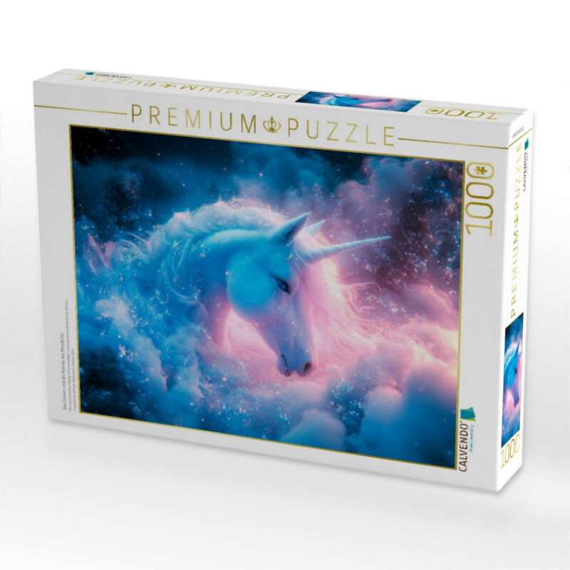 In einem Traum aus Rosé, dunkelblau und Licht erhebt sich das Einhorn, majestätisch und voller Anmut. Sein seidiges, weißes Fell schimmert im sanften Glanz des Mondlichts, während die wallende Mähne in leichten Wellen tanzt, als würde der Wind selbst ihm Liede...