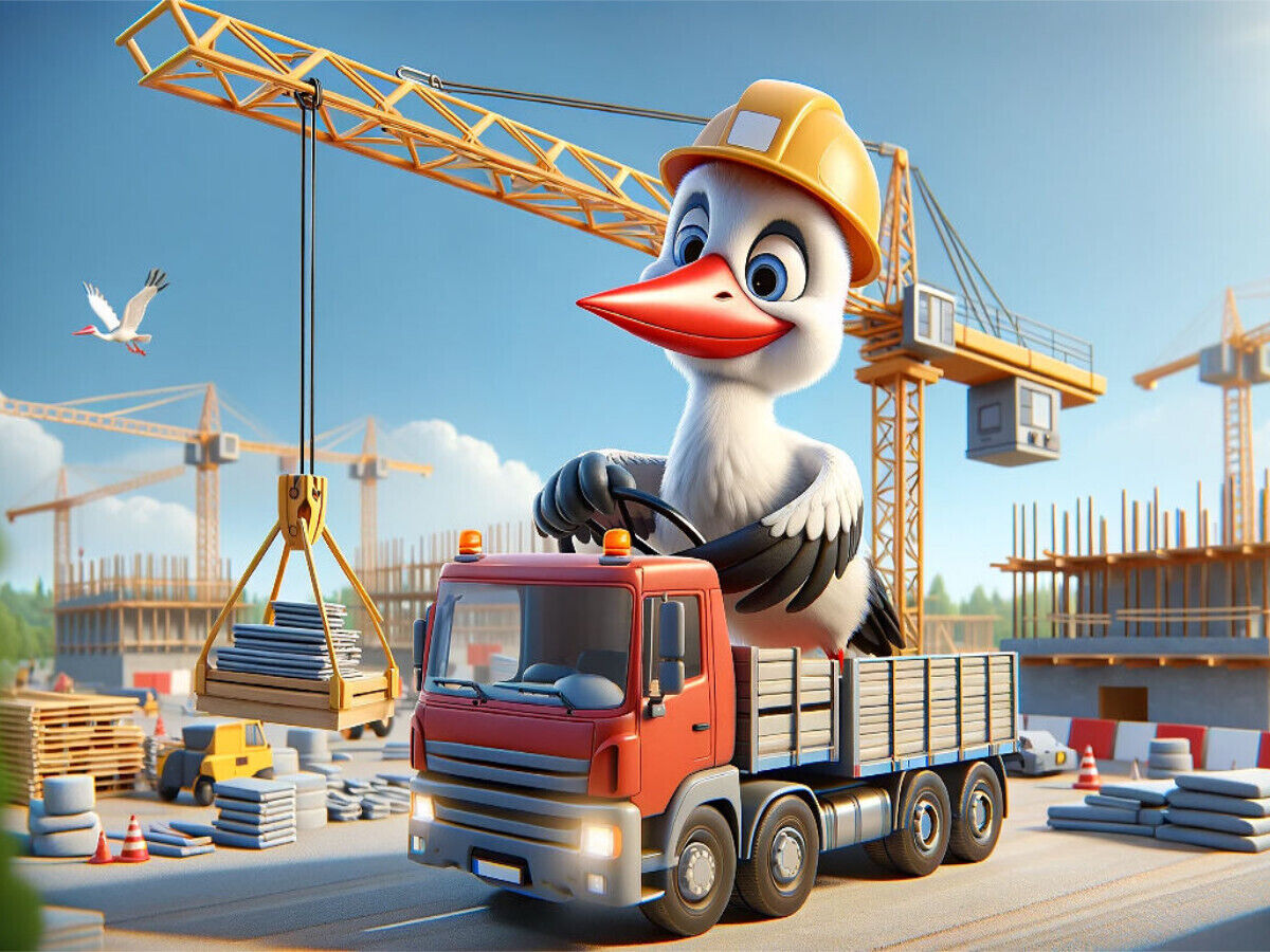 Ein Storch zeigt seine Fähigkeiten am Steuer eines LKWs auf der Baustelle.Mit Leichtigkeit manövriert er seinen LKW durch die Hindernisse jeder Baustelle. Eine dynamische und KI-generierte Szene voller Humor.