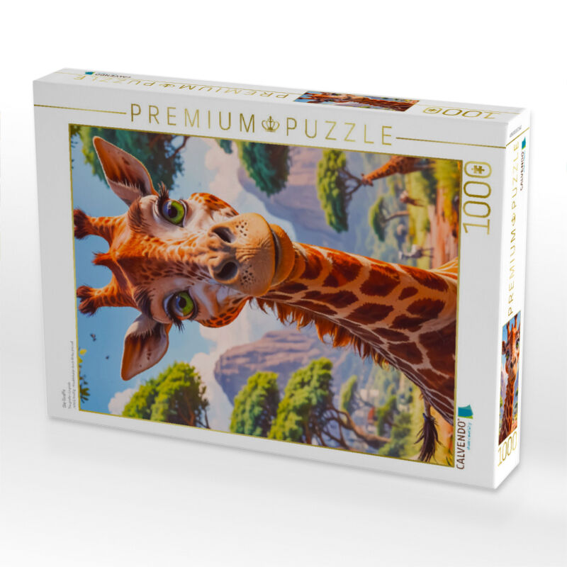 Das Bild zeigt eine super niedliche Giraffe mit riesigen, funkelnden Augen, die voller Neugier und Sanftheit strahlen. Ihr kleiner, runder Kopf mit den flauschigen Hörnchen und das sanfte Lächeln verleihen ihr einen besonders liebenswerten Charme. Mit ihrem ge...
