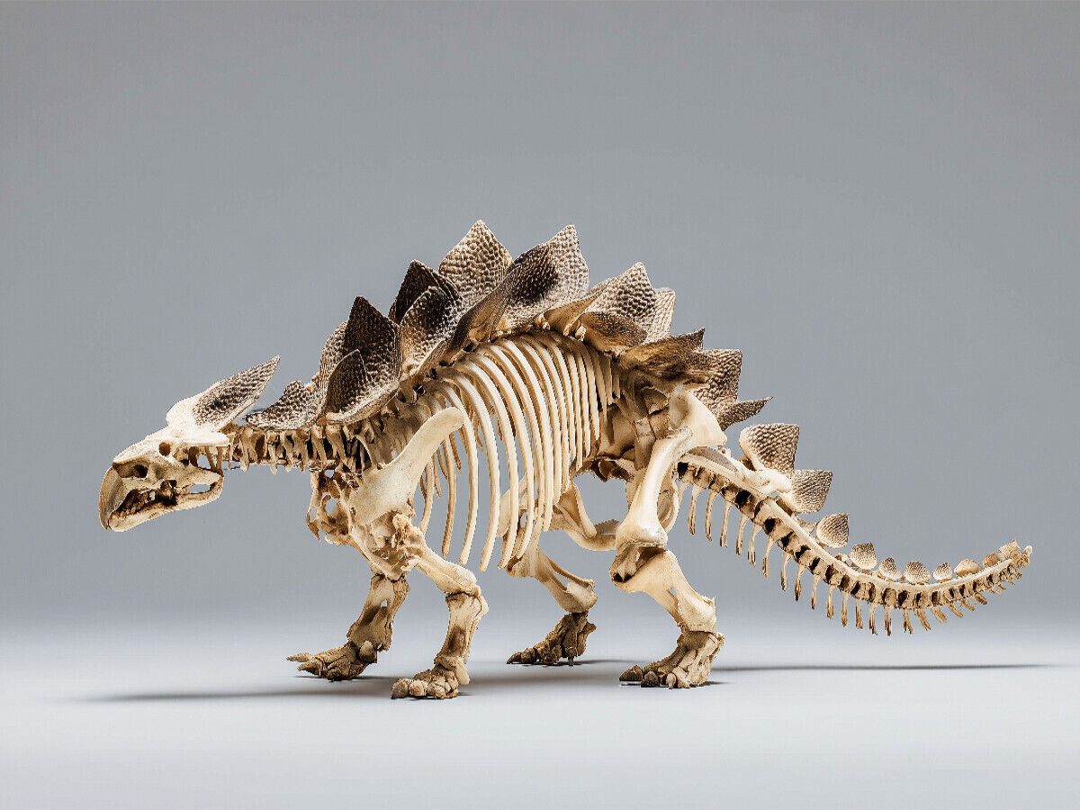 Dieser Dinosaurier zeigt, was Panzerung bedeutet: Das Skelett eines Ankylosaurus mit markantem Keulenschwanz und Rückenplatten steht eindrucksvoll im Raum - klar beleuchtet und in beeindruckender Detailtiefe. Das Bild wurde mithilfe künstlicher Intelligenz gen...