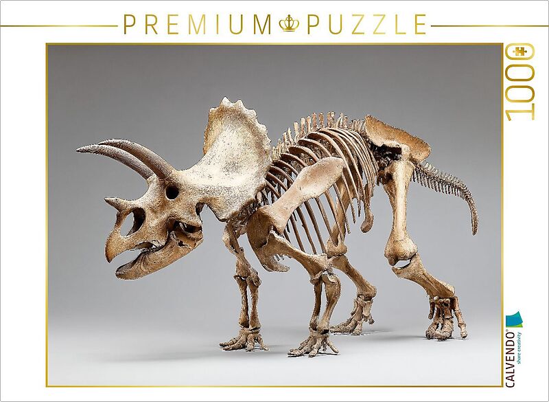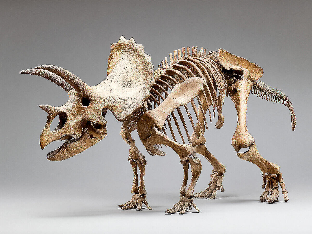 Mit seinen drei Hörnern und dem gewaltigen Nackenschild gehört der Triceratops zu den eindrucksvollsten Pflanzenfressern der Kreidezeit. Dieses detailreiche Skelett wurde mithilfe künstlicher Intelligenz erstellt und zeigt das Tier in kraftvoller Standposition...