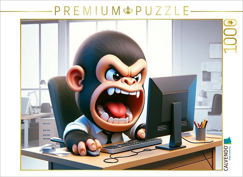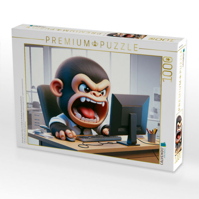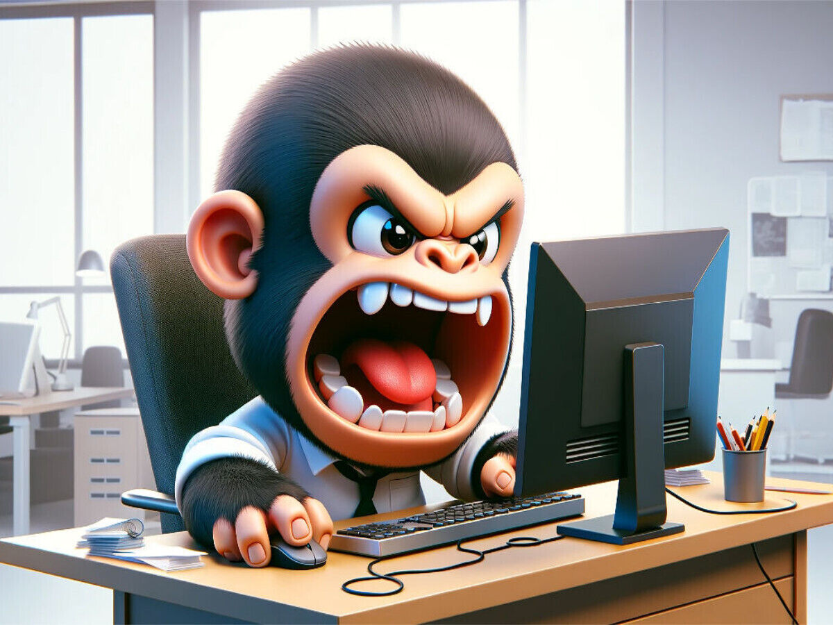 Dieses Bild, erstellt mit künstlicher Intelligenz, zeigt einen 3D-gerenderten Cartoon-Gorilla, der in einem Büro an einem PC sitzt. Sein Mund ist weit geöffnet, während er schreit und die Tastatur durch den Raum wirft. Der Stil ist eine Mischung aus Fotorealis...
