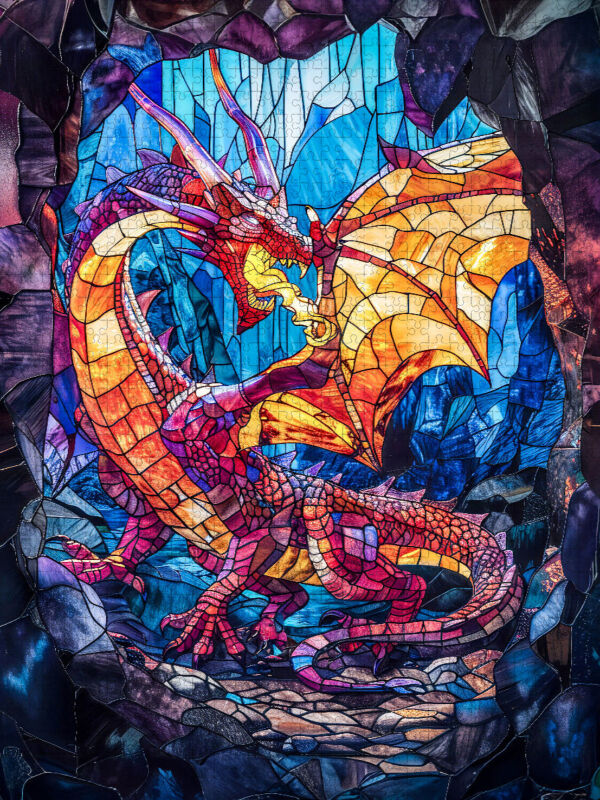 Ein mächtiger Drache ruht tief in seiner Höhle, die Dunkelheit nur durch das Glühen seiner Augen durchbrochen. Seine gewaltigen Schuppen schimmern im fahlen Licht, während er geduldig auf seine nächste Beute wartet.