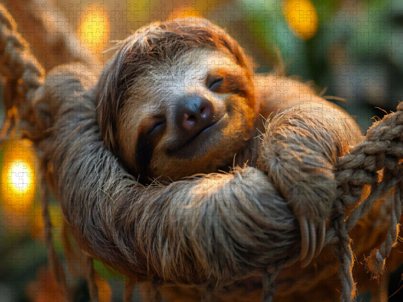 Erleben Sie die pure Entspannung mit unserem KI-generierten Bild: Ein gemütliches Faultier schlummert friedlich in einer Hängematte, während die warmen Spätsommerstrahlen durch die Blätter schimmern. Diese harmonische Szene strahlt Gelassenheit und die ruhige ...