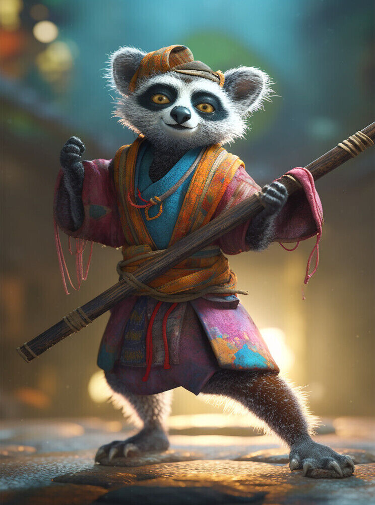 Erleben Sie die Schönheit und den Mut der animalischen Ritter Japans. Das Bild wurde von einer künstlichen Intelligenz generiert und zeigt einen Lemur als Samurai in voller Rüstung.