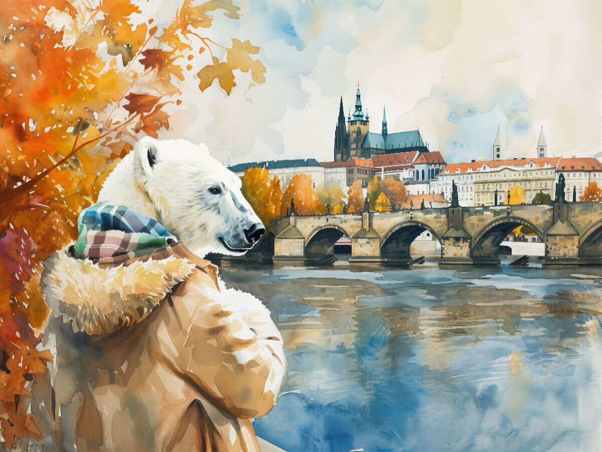 Ein Eisbär auf Europareise, eine Vorstellung, die sich mit Hilfe von KI visualisieren lässt. Erfreuen Sie sich an diesem hübschen Aquarellbild, ob als Wandbild oder als Puzzle.