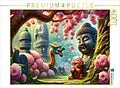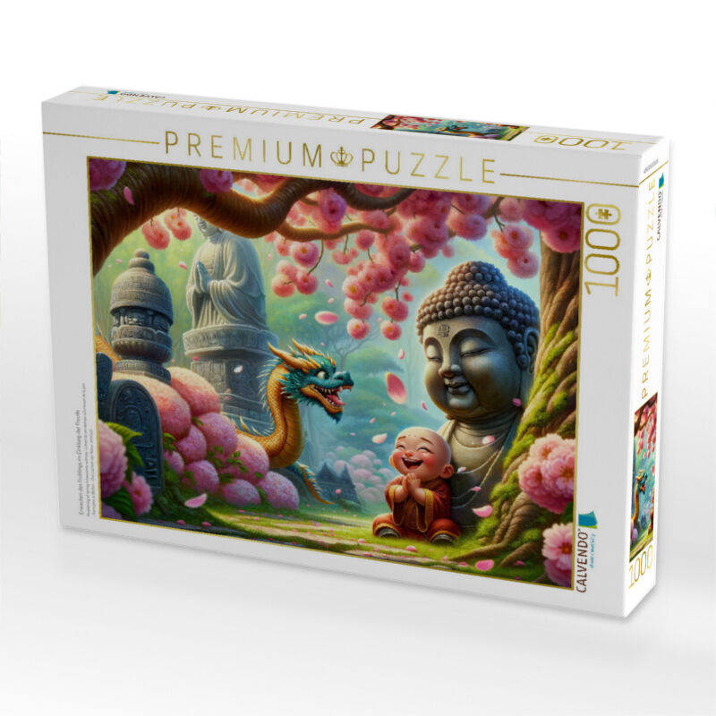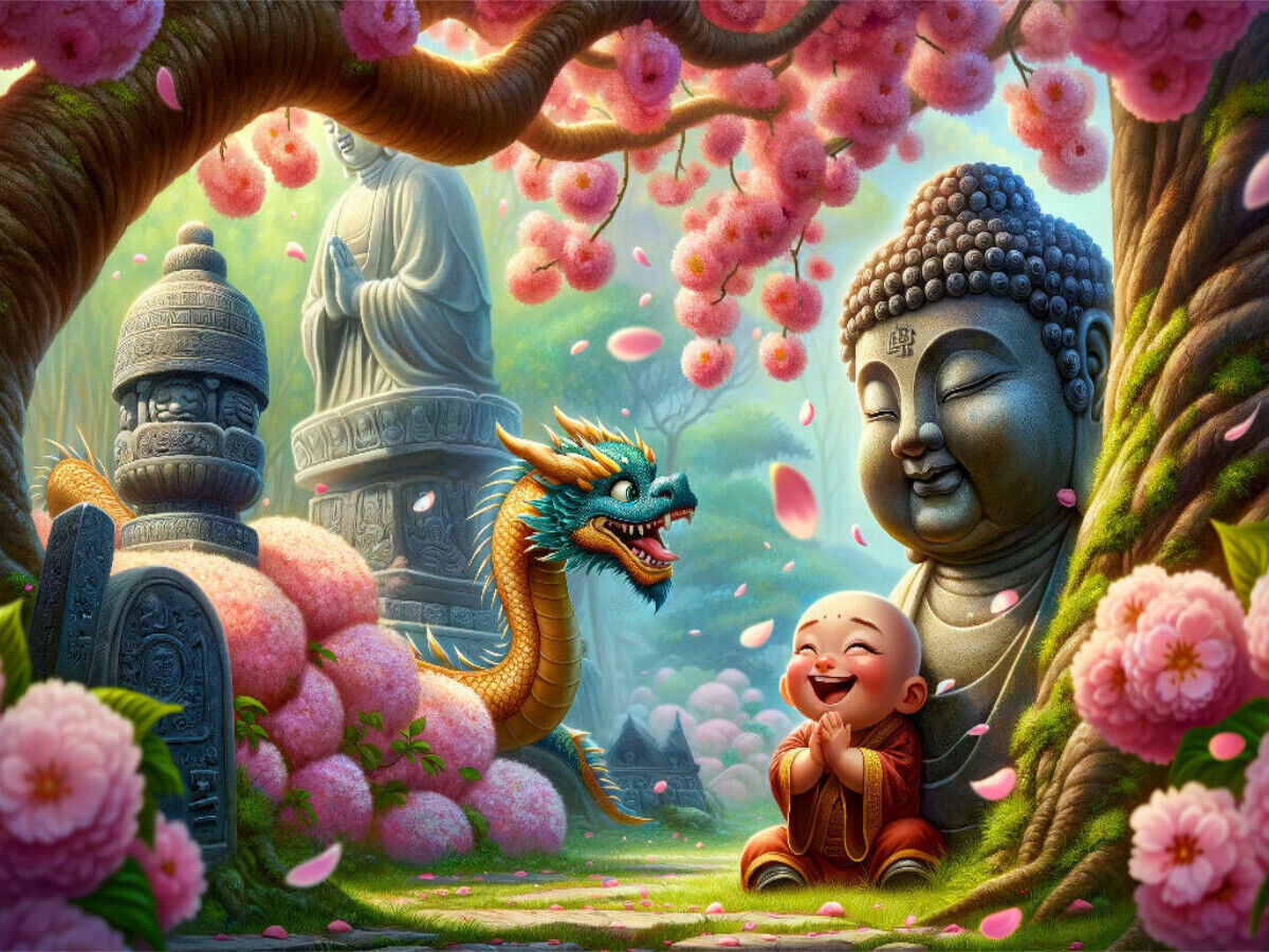 In einer Welt, wo Frühlingserwachen und Freundschaft Hand in Hand gehen, bringt ein lachender Mönch neben seinem Drachenfreund das Herz des Tempelgartens zum Schwingen. Von künstlicher Intelligenz erschaffen, fängt dieses Bild die reine Essenz des Glücks ein -...