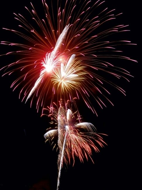 Ein Motiv aus dem Kalender Feuer... über der Stadt / Roland Störmer: Ein typisches Feuerwerk bei einer abendlichen Veranstaltung in einer Kleinstadt. Treffend im Bild festgehalten. Einzelne Feuerwerkskörper separiert - gleich einem Portrait. Egal ob als Gesche...