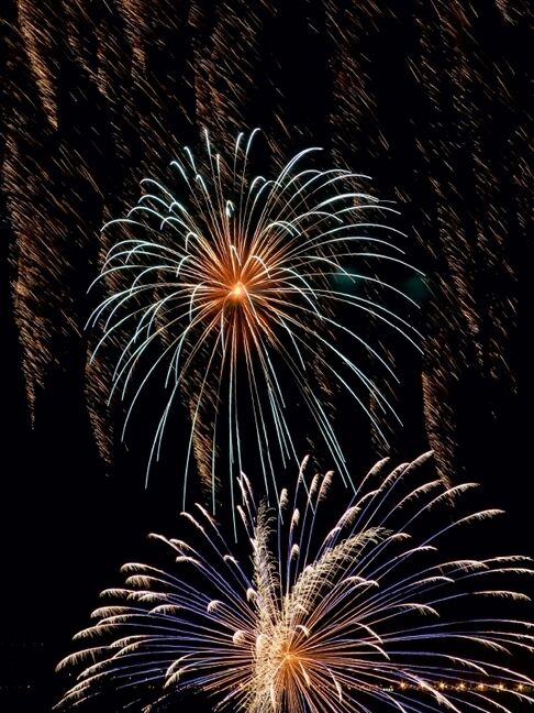Ein Motiv aus dem Kalender Feuer... über der Stadt / Roland Störmer: Ein typisches Feuerwerk bei einer abendlichen Veranstaltung in einer Kleinstadt. Treffend im Bild festgehalten. Einzelne Feuerwerkskörper separiert - gleich einem Portrait. Egal ob als Gesche...