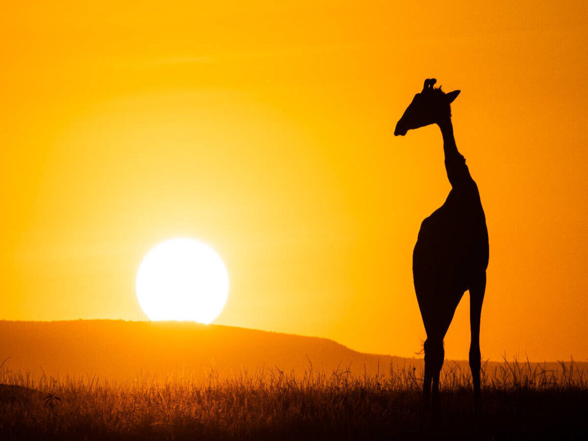 Eindrucksvolles farbenfrohes Bild einer Giraffe, die scheinbar den Sonnenaufgang beobachtet. Entstanden in der Masai Mara, Kenias wildreichstem Naturschutzgebiet.