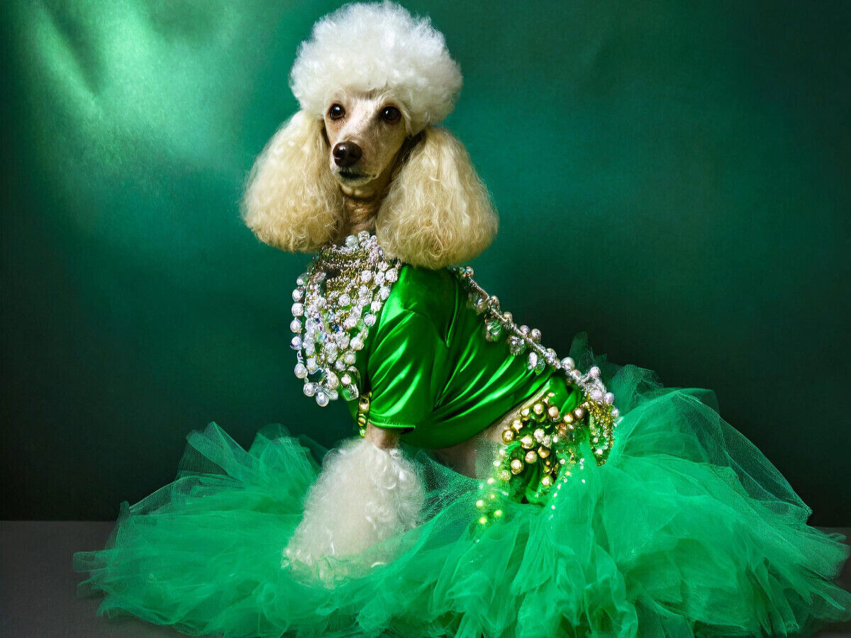 Ein Hund wie eine Diva, voller Eleganz und Ausstrahlung, die eine beeindruckende Präsenz und ein starkes Selbstbewusstsein ausstrahlt. Wie eine Diva trägt er einen glamourösen Kleiderstil, in aufwendigen, stilvollen Outfits, die seine Persönlichkeit unterstrei...