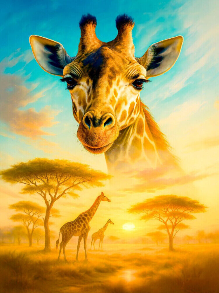 Majestätisch und friedlich - Giraffe und Baum vereint in einem Kunstwerk aus dem Kalender "Afrikas wilde Seele - Magische Tierwelt im Porträt". Giraffen im Morgenlicht.