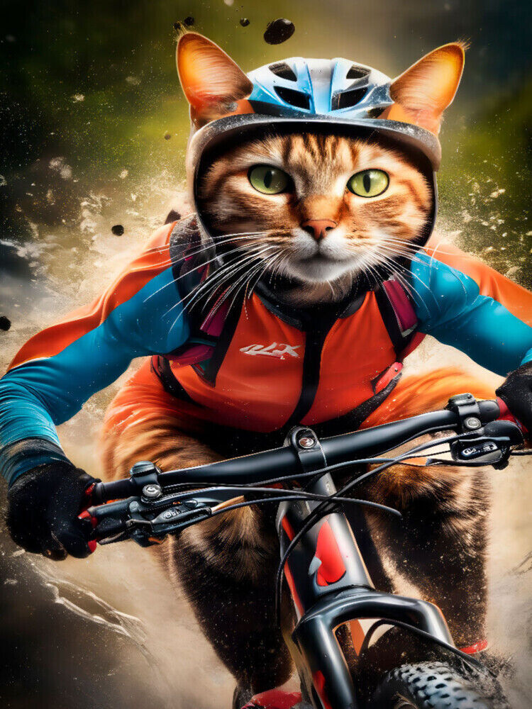 Eine unternehmungslustige Katze zeigt, was sie alles bei Ihren Streifzügen anstellt. Hier macht das sportliche Samtpfötchen gerade eine Tour mit dem Mountainbike. Das Motiv wurde in Zusammenarbeit mit künstlicher Intelligenz sowie ohne Tierleid erschaffen und ...