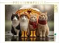 Vier Katzen stehen eng beisammen unter einem bunten Regenschirm, zwei tragen Regenstiefel, zwei kuschelige Schals. Der Regen fällt sanft herab und verleiht der Szene eine verspielte, charmante Stimmung. Ob als Katze im Regen, Katzen mit Regenschirm oder einfac...