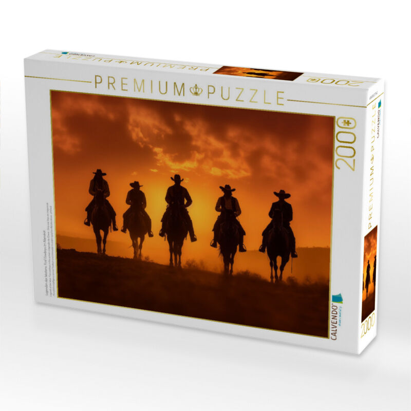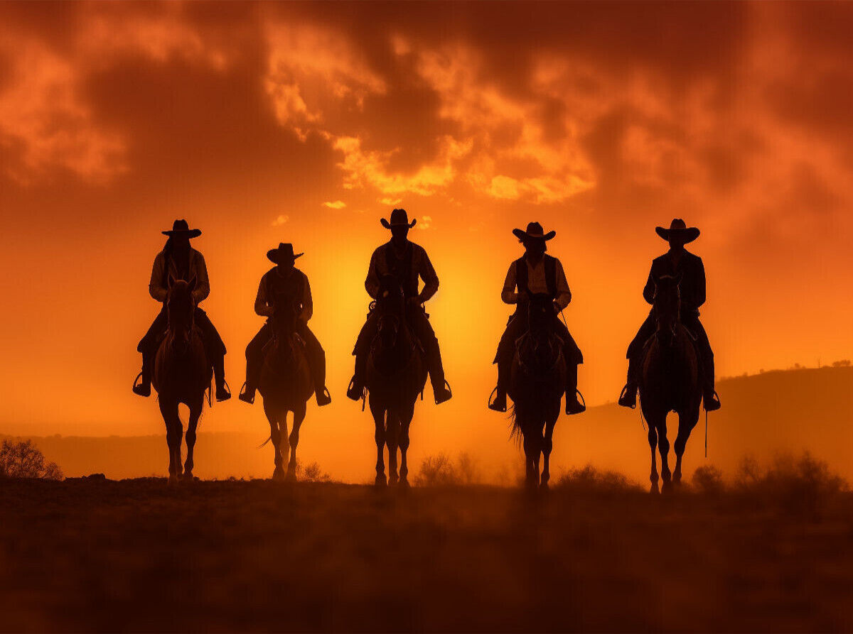 "Legenden des Westens" präsentiert ein atemberaubendes Foto, auf dem fünf Cowboys majestätisch in den warmen Farben des Sonnenuntergangs reiten. Dieses künstlich geschaffene Meisterwerk fängt die Essenz der Freiheit, des Abenteuers und der gemeinsame...