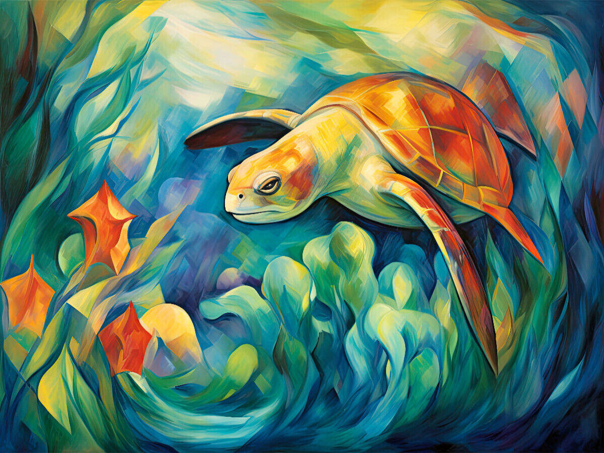 Die Tier- und Pflanzenwelt unter Wasser ist farbenfroh, wie geschaffen für ausdrucksstarke Gemälde. Dieses bezaubernde Bild im Stil eines expressionistischen Malers wurde mit Hilfe von KI kreiert.