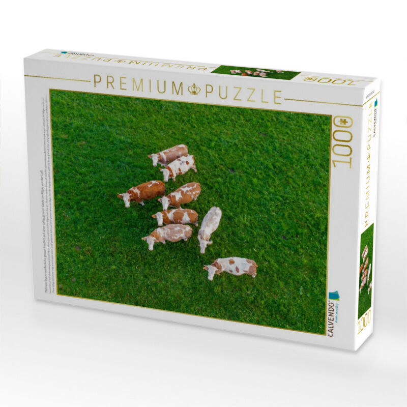 Aus der Vogelperspektive zeigt dieses Bild eine Herde braun-weißer Kühe, die sich ruhig über eine saftig grüne Wiese im Allgäu verteilt. Die klare Draufsicht macht aus der natürlichen Szene ein fast grafisches Muster - ländlich, beruhigend, harmonisch. Man spü...