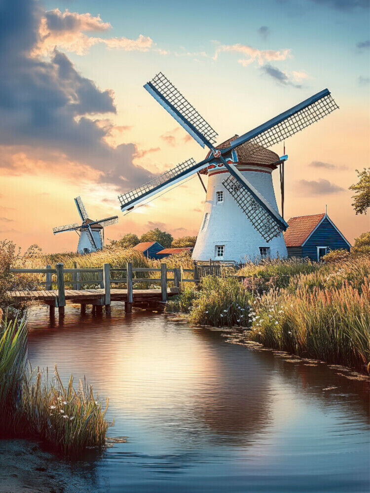 Sanft drehen sich die Flügel von Windmühlen im Spiel von Licht und Schatten, während zarte Pastellfarben die Zeit einfangen - mal ein Hauch von Sommer, mal ein stiller Wintertraum. Einst unentbehrlich für das Mahlen von Getreide und ein Sinnbild für die Versor...
