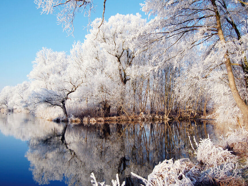 Ein Motiv aus dem Kalender "Raureifzauber im Havelland" von Anja Frost: Winterlandschaften üben immer einen besonderen Reiz aus, aber wo Nebel auf eisige Kälte trifft, überzieht Raureif das Land mit einem weißen Kleid aus zerbrechlichen Eiskristallen...