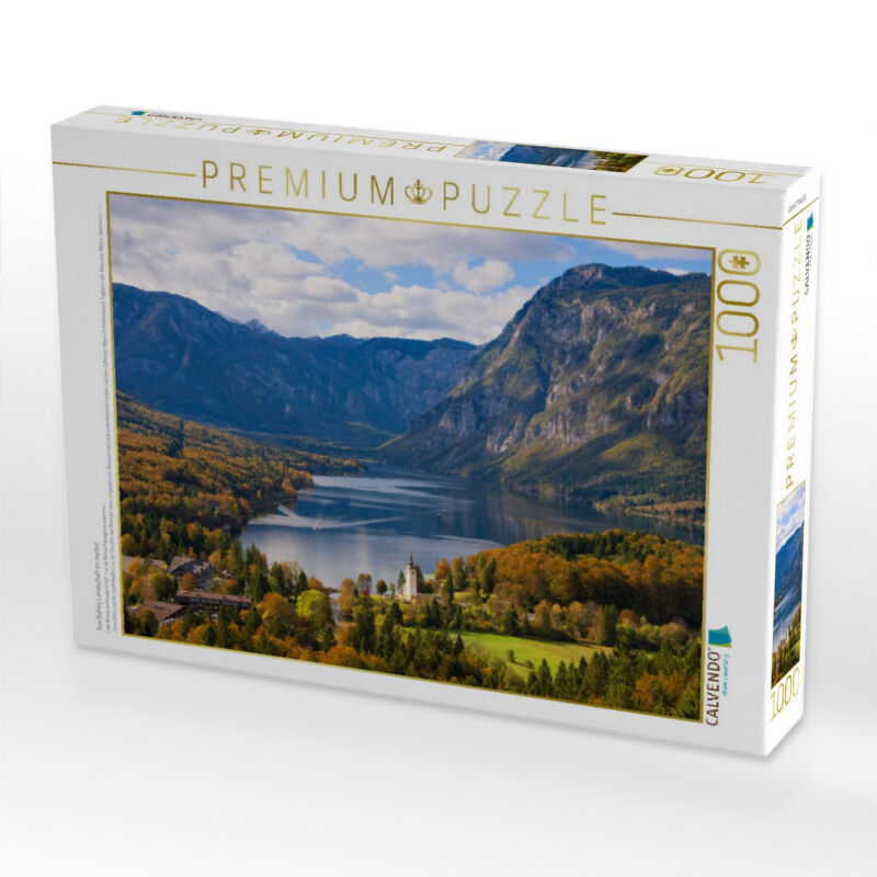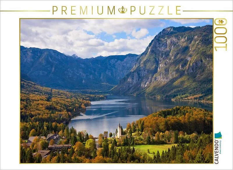 Eine Fähre und die Stadt Ribcev Laz am Seeufer des Bohinjer Sees, umgeben von Bäumen mit Laub in herbstlichen Farben und den Julischen Alpen im Nationalpark Triglav in der Nähe von Bled in Slowenien. Ein Motiv aus dem Kalender "Slowenien Landschaften - 20...