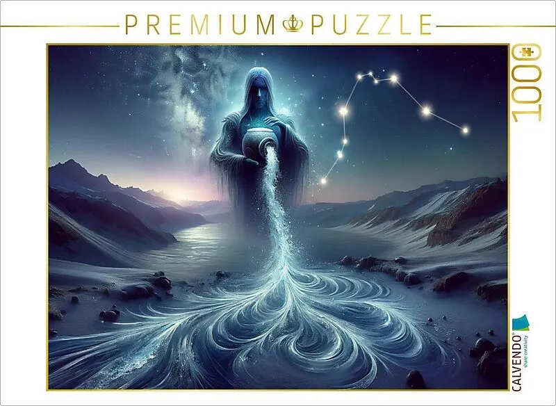 Dieses Bild stellt eine surreale Darstellung des Sternzeichens Wassermann für den Monat Februar dar. Eine mystische Figur, die den Wassermann symbolisiert, hält ein Gefäß, aus dem Wasser und Sterne fließen und sich in die Umgebung einer gefrorenen, sternenerle...