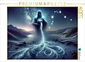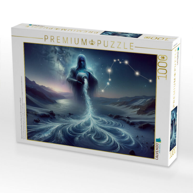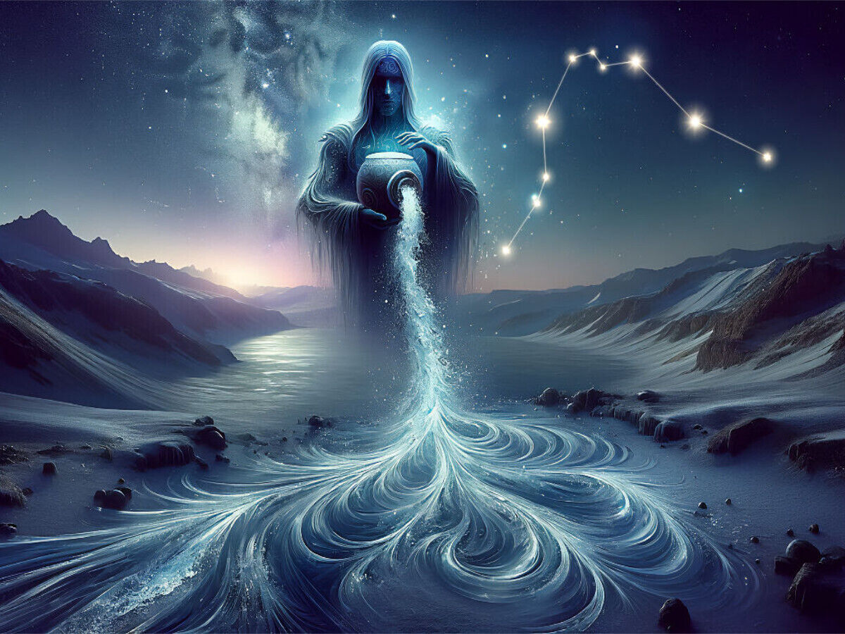 Dieses Bild stellt eine surreale Darstellung des Sternzeichens Wassermann für den Monat Februar dar. Eine mystische Figur, die den Wassermann symbolisiert, hält ein Gefäß, aus dem Wasser und Sterne fließen und sich in die Umgebung einer gefrorenen, sternenerle...