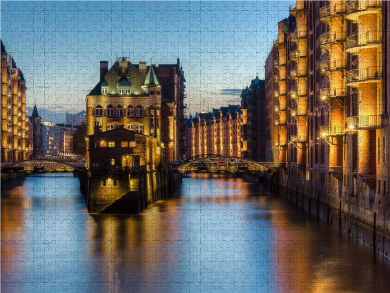 Das Wasserschloss in Hamburg zur blauen Stunde. Ein Motiv aus dem Kalender "Städte und Sehenswürdigkeiten in Deutschland 2017" von Michael Valjak Egal ob als Geschenk oder zum Selbermachen: Puzzles sind unterhaltend und fördern das Wohlbefinden. Puzz...