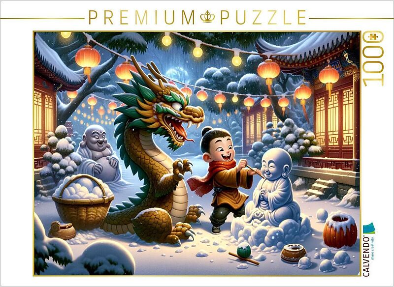 Ein junger Mönch und ein lebhafter Drache genießen die erste Schneedecke im Tempelgarten. Ihre Freude, eingefangen durch künstliche Intelligenz, belebt die stille Winternacht. Die Szene ist durchzogen von der Wärme des Lachens und dem Leuchten der Laternen, di...