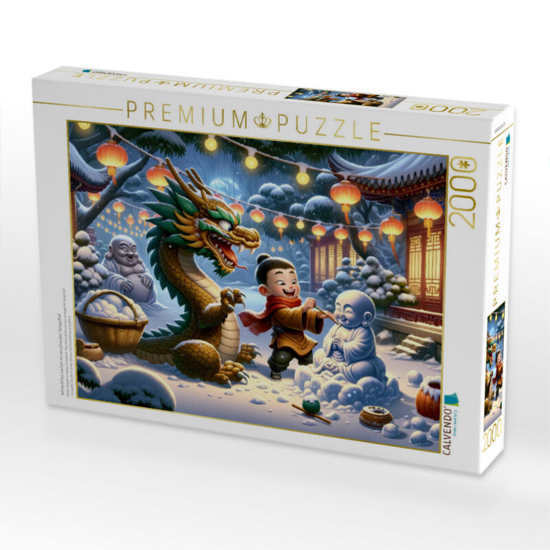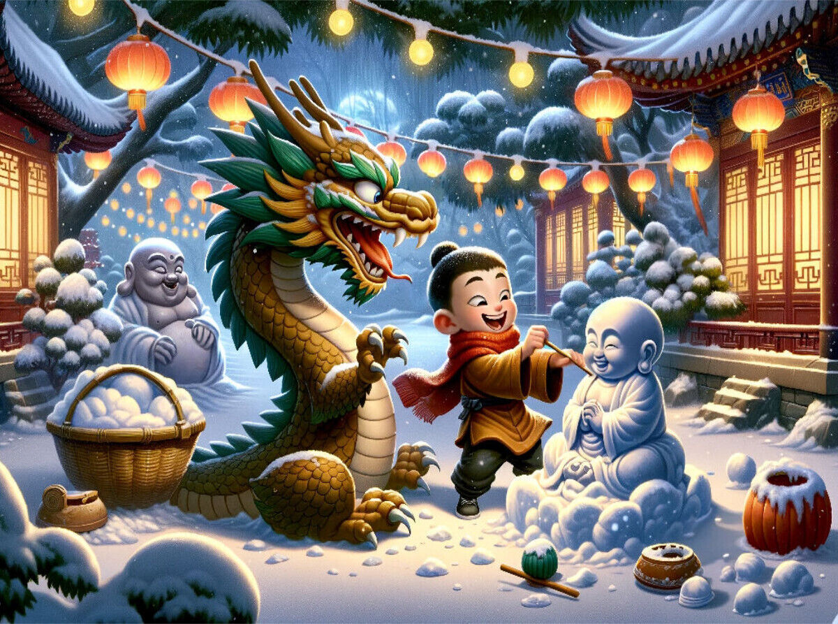 Ein junger Mönch und ein lebhafter Drache genießen die erste Schneedecke im Tempelgarten. Ihre Freude, eingefangen durch künstliche Intelligenz, belebt die stille Winternacht. Die Szene ist durchzogen von der Wärme des Lachens und dem Leuchten der Laternen, di...