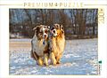 Blue merle und red merle Aussie spielen gern gemeinsam mit ihrem Spielzeug, hier tragen sie gemeinsam den Ball und freuen sich über das schöne, sonnige Winterwetter.