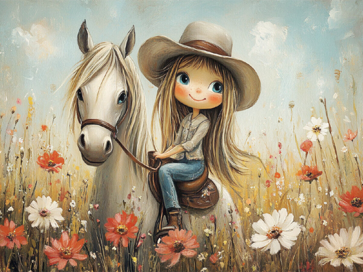 Dieses Bild fängt die besondere Verbindung zwischen Menschen zu tierischen Freunden ein. Die Szene auf einer blühenden Wiese regt zum Träumen an und versprüht eine friedliche, unbeschwerte Atmosphäre. Ein liebevoll gestaltetes Motiv, das mit Hilfe von KI reali...